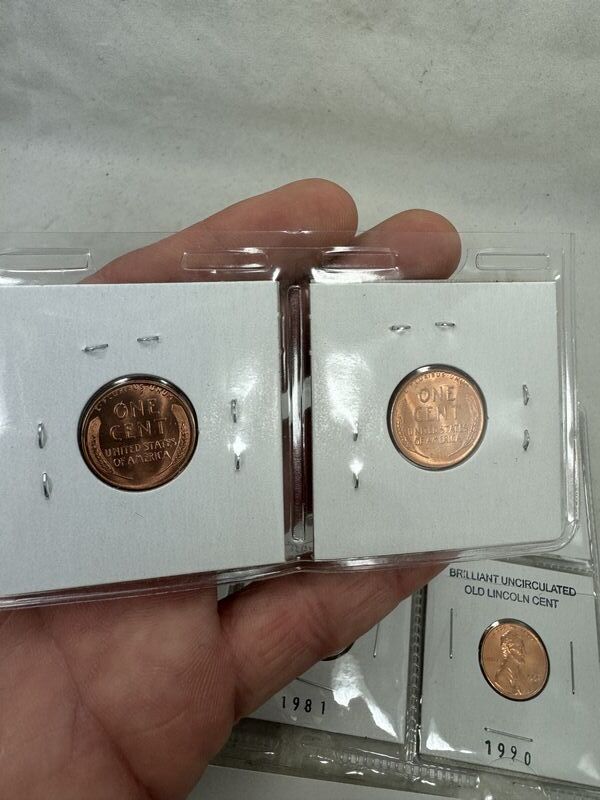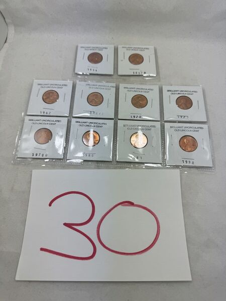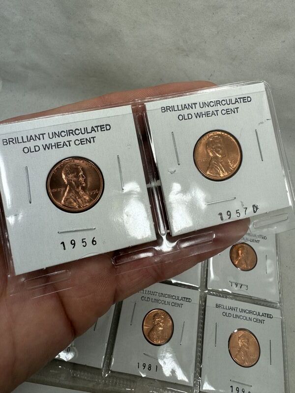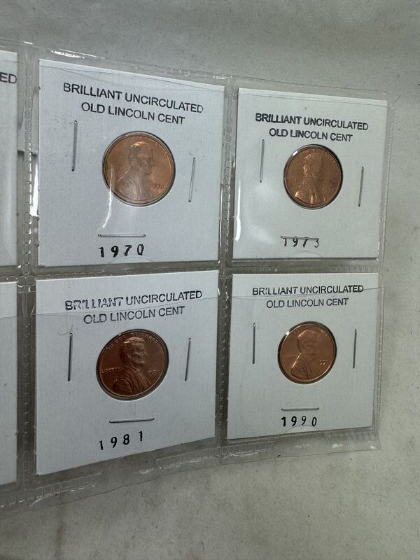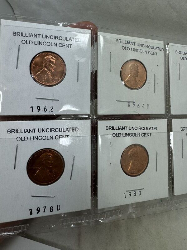Uncirculated brilliant penny lot, two wheat pennies the rest are Lincoln cent. See photos sold as is