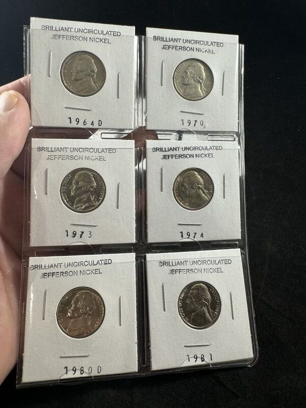 Various years. There’s six brilliant uncirculated nickels see photos sold as is.