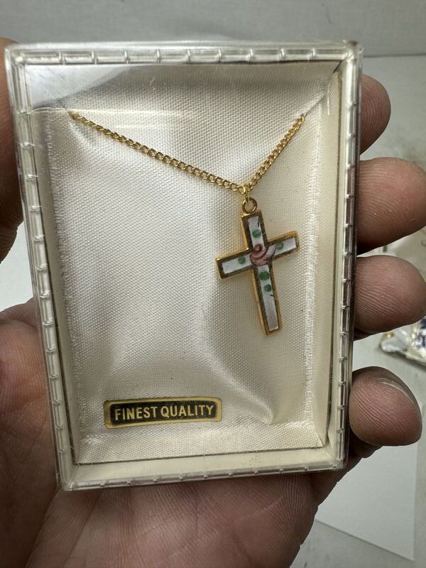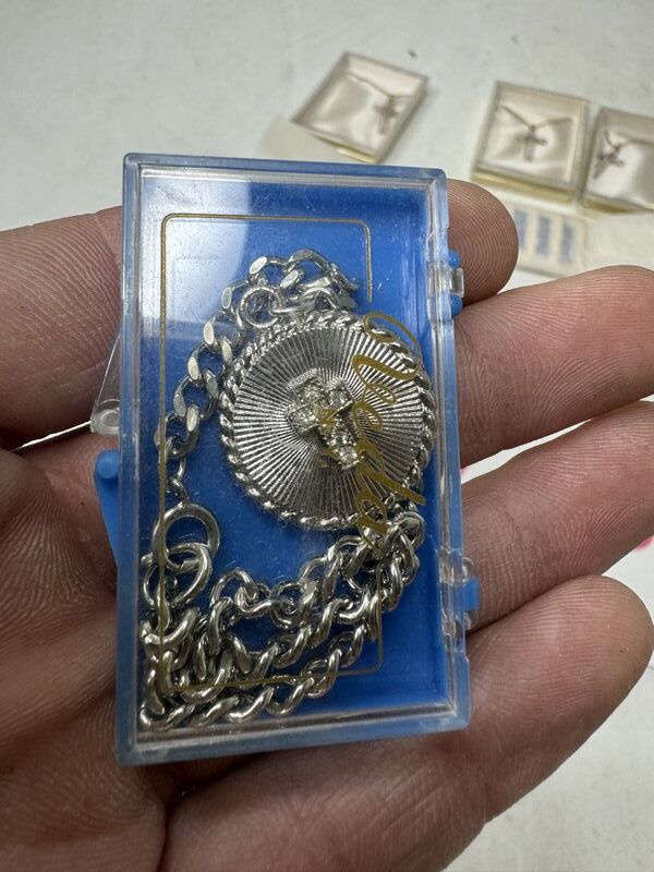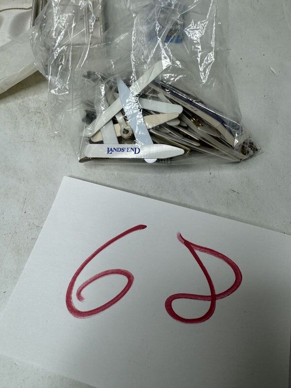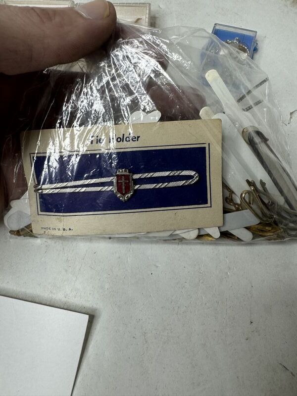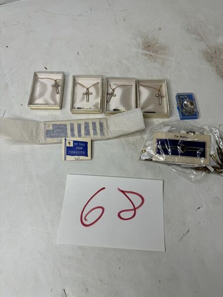 Multiple quantities of necklaces, tie, clasp, collar stays, and collar pin. See photos for description sold as as.