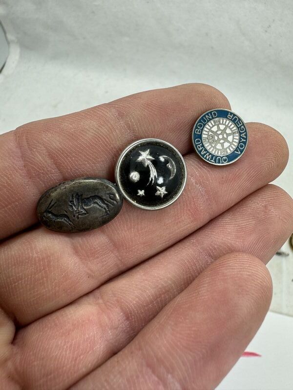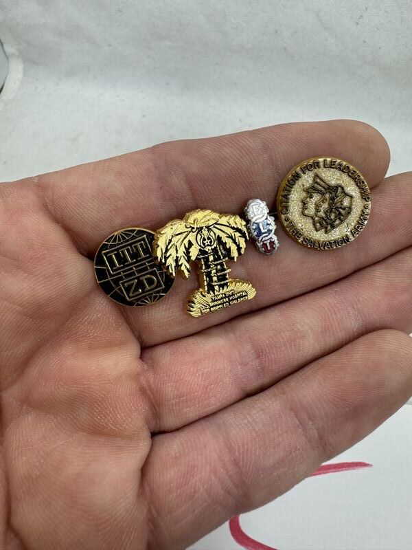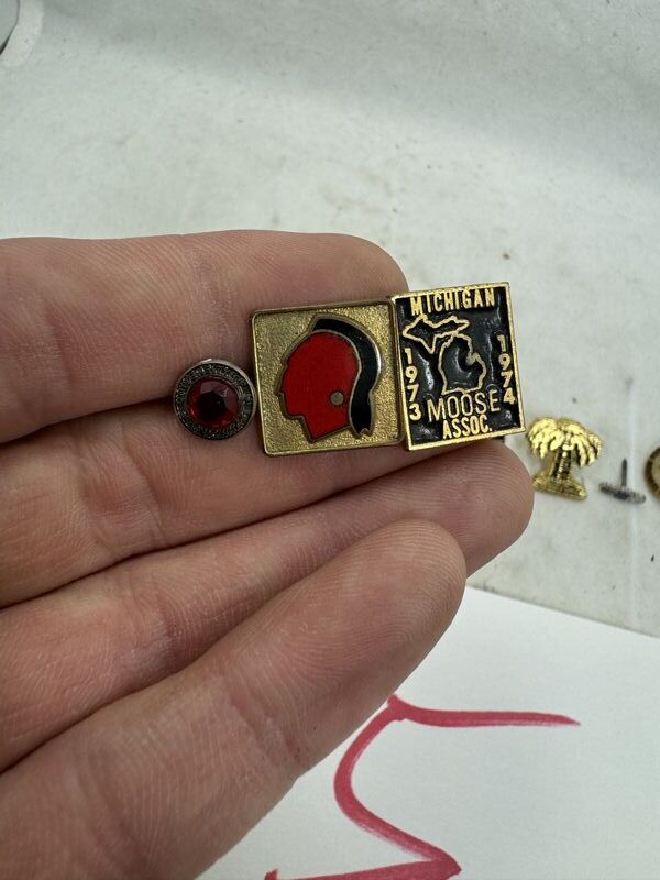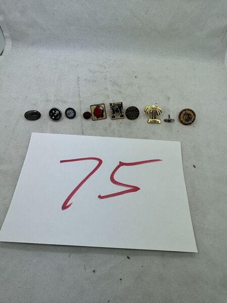 Tie pin lot of 10 various types of pins, the Shriners club, the Longfellows, the salvation Army, university of Cincinnati, Michigan, moose association, and others no backs on pins. see photos sold as is