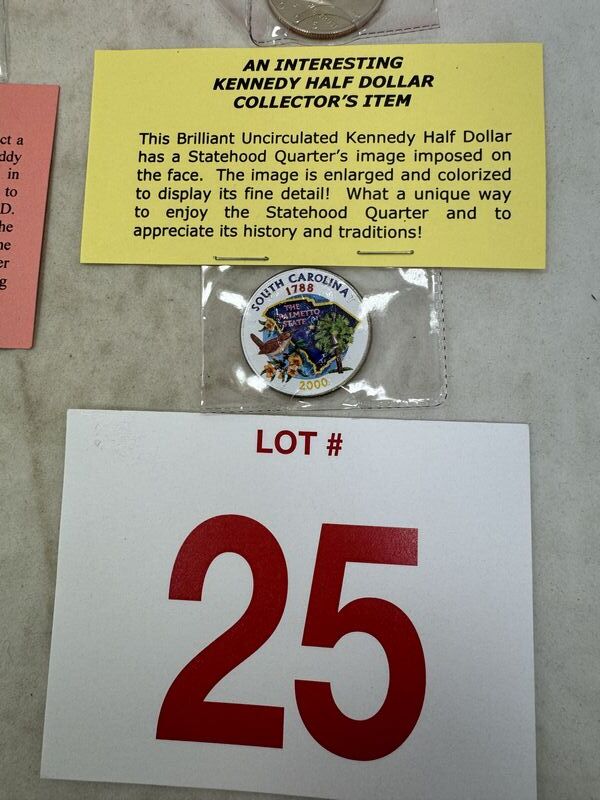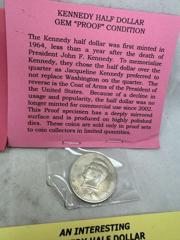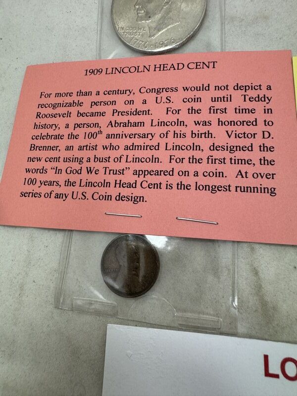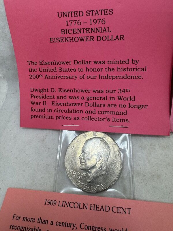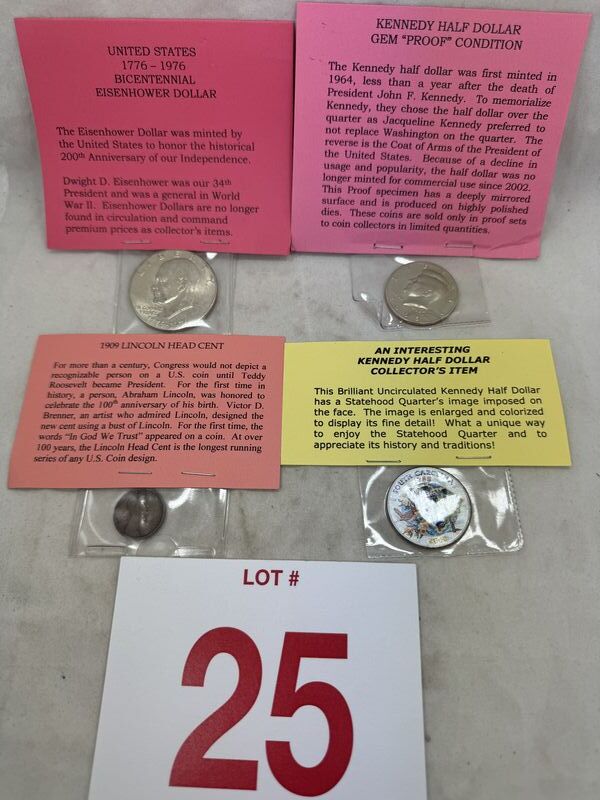 Bicentennial Eisenhower dollar, proof condition Kennedy half dollar, a collectors edition Kennedy half dollar painted like a quarter, and a 1909 Lincoln head cent