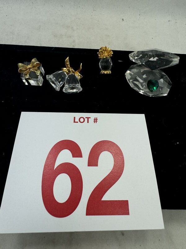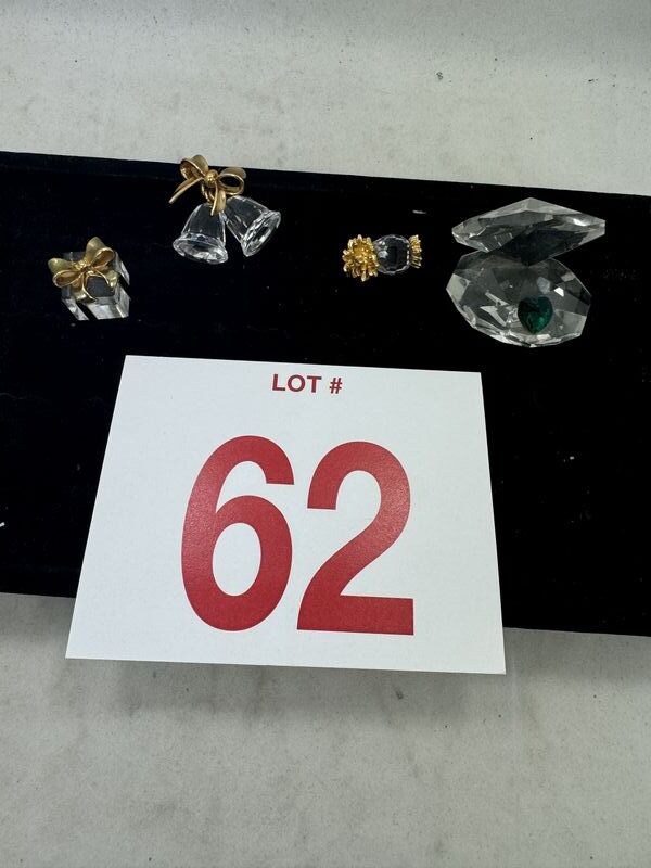 The bells and gift box is marked with the Swarovski logo, the other two crystals are unmarked. See photos for description sold as is.