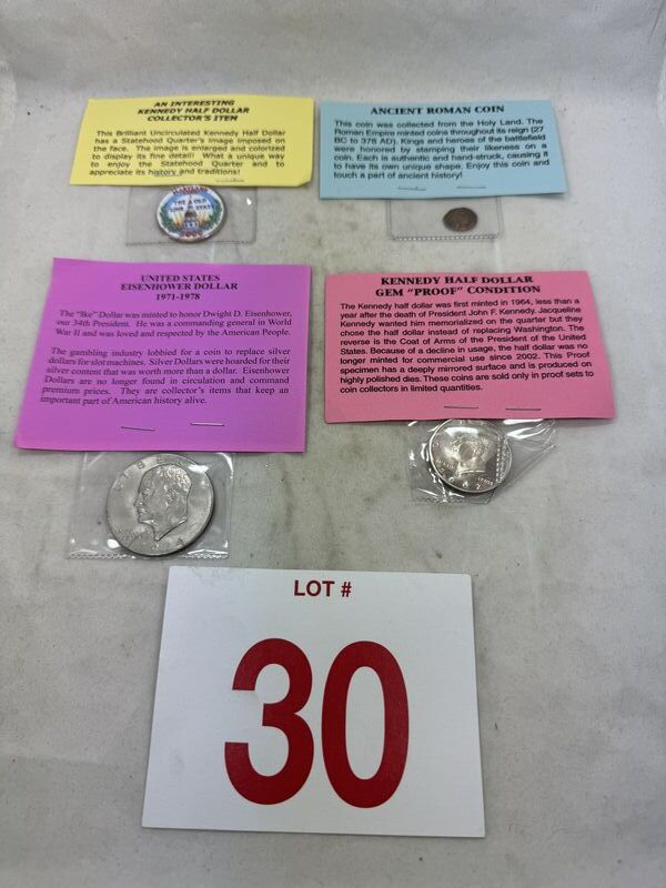 Ancient roman coin, United states Eisenhower dollar 1974, An interesting kennedy half dollar collectors item, kennedy half dollar gem proof condition see photos sold as is