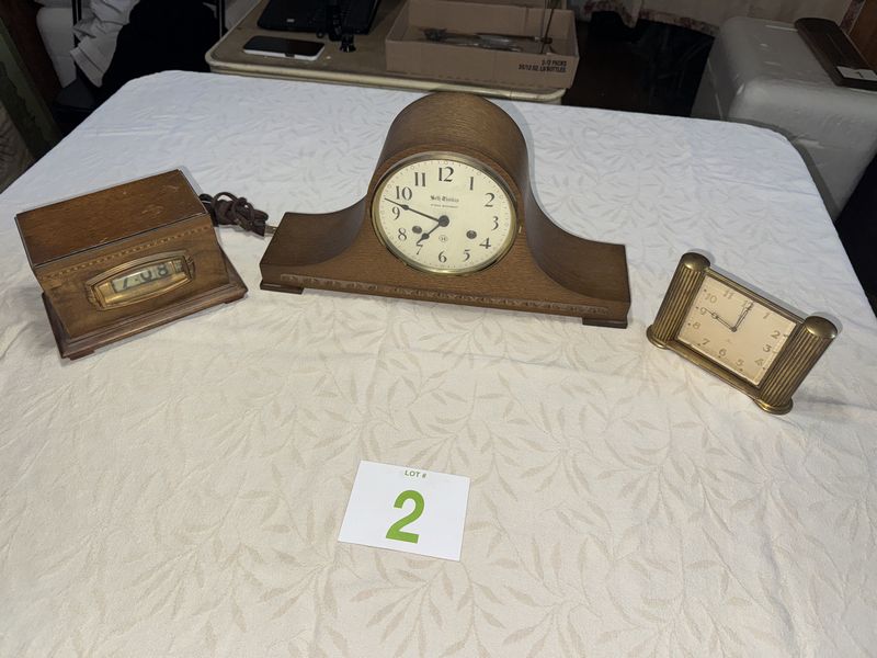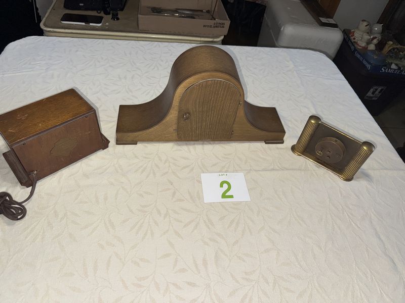 Seth Thomas mantle clock. Pennwood desk clock. Semca brass clock. All untested, see photos, sold as is.