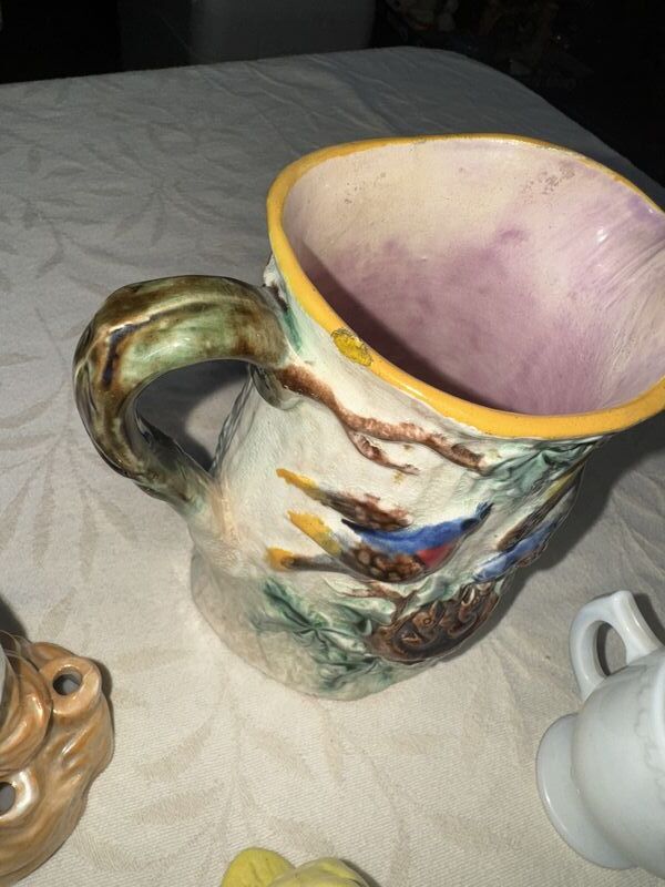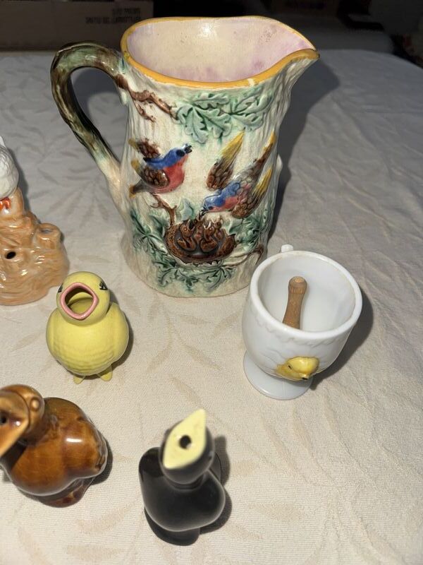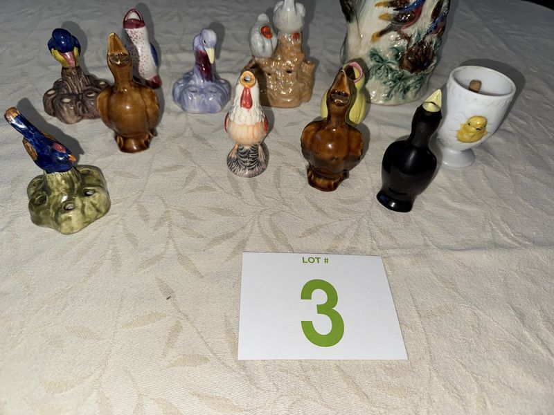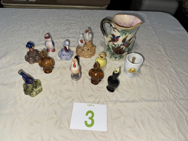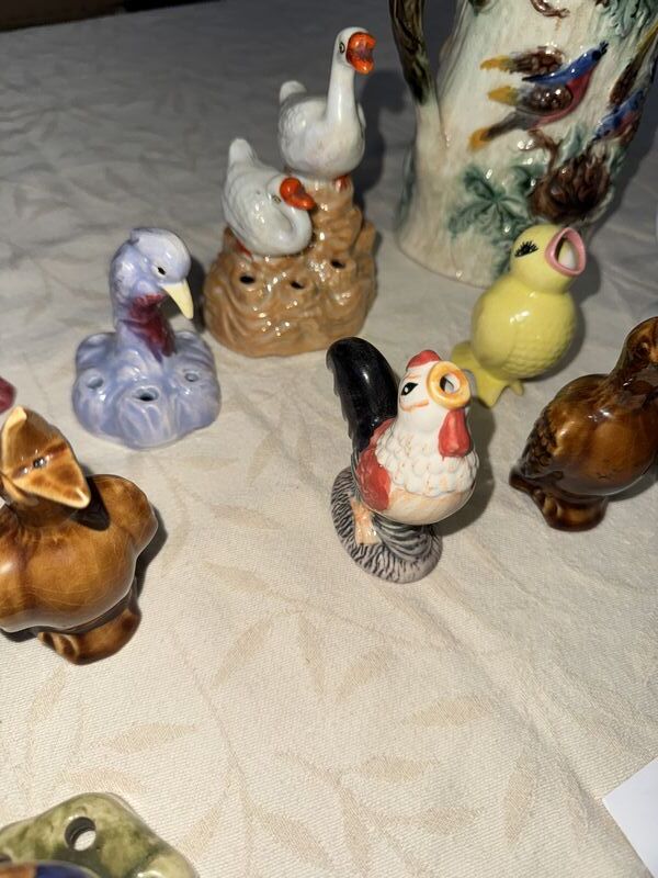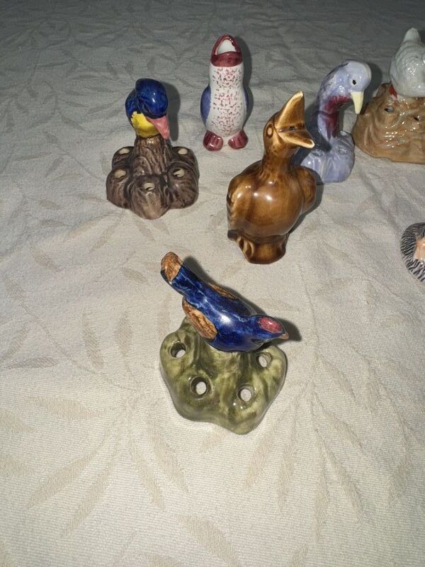 Pie baking vents, bird flower frogs, porcelain bird picture, one egg cup, no chips or cracks on the figurines, some crazing. Small chips on the picture. See photos sold as is.