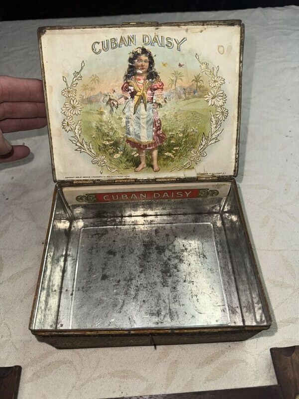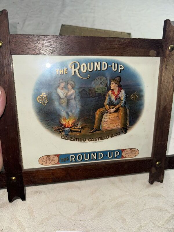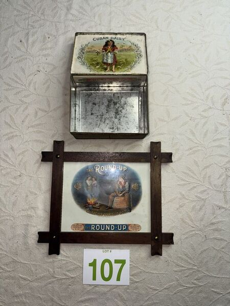 Framed Advertising, cigar metal tin, See photos, sold as is.
