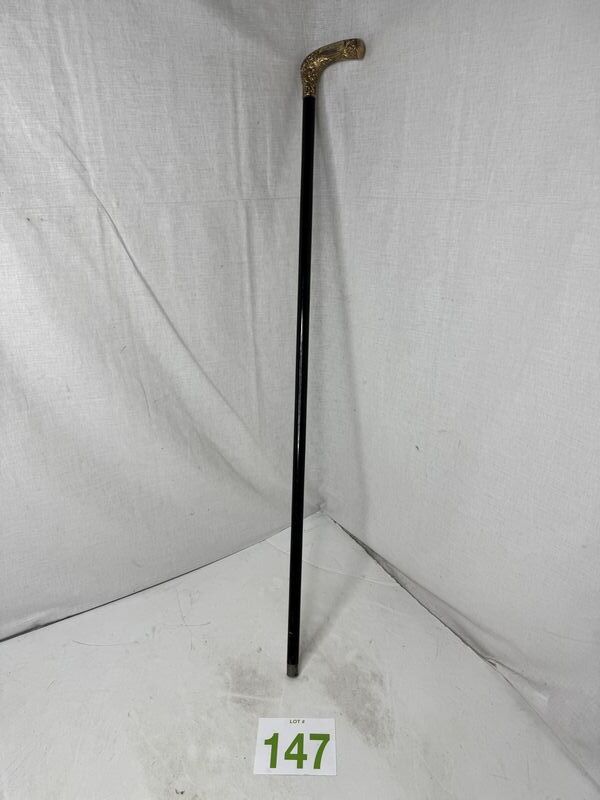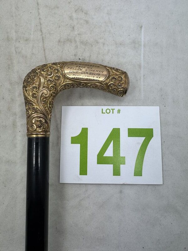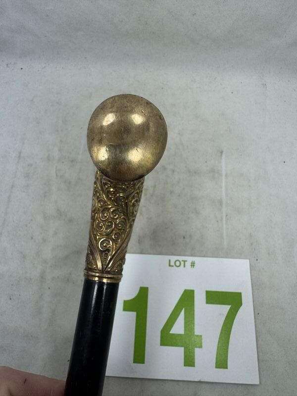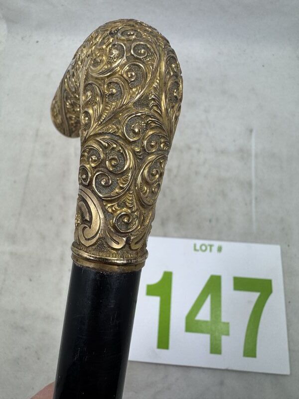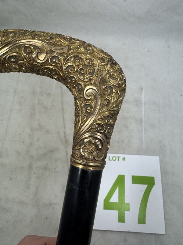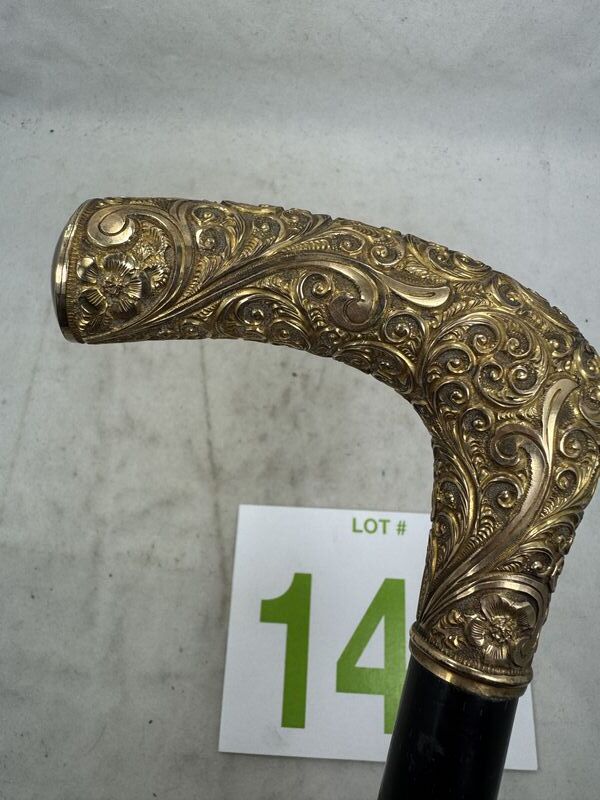 Measuring 35" long, this antique Gentleman's Cane has a 3 1/4" long, hand repousse, gold-filled top. The top is hand engraved,” and beautiful bright-cut scroll and filigree design. This gold-filled top is in original condition with no wear or dents . The ebonized shaft is original and it still retains its original steel ferrule
