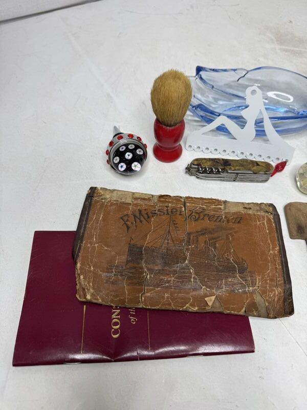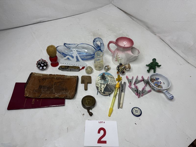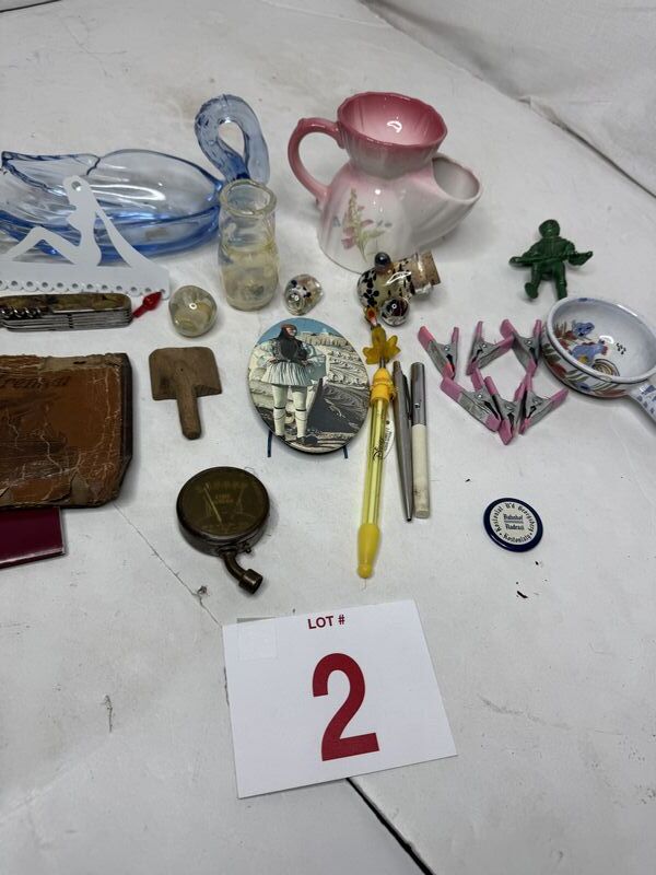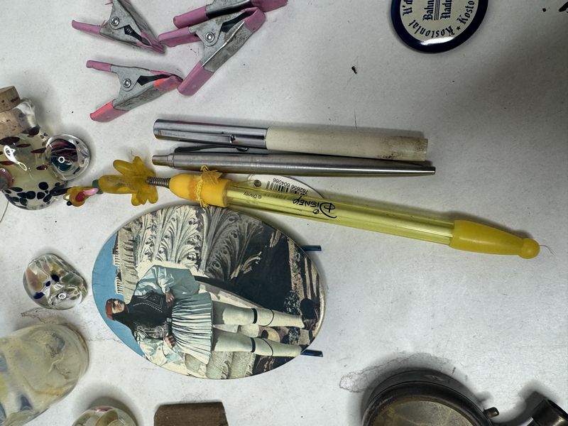 Pens, pins, glassware, collectibles, see photos sold as is.