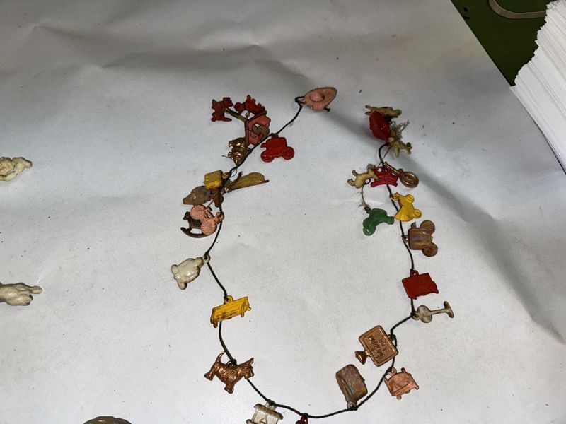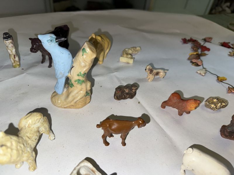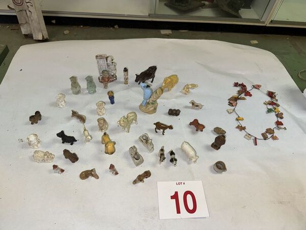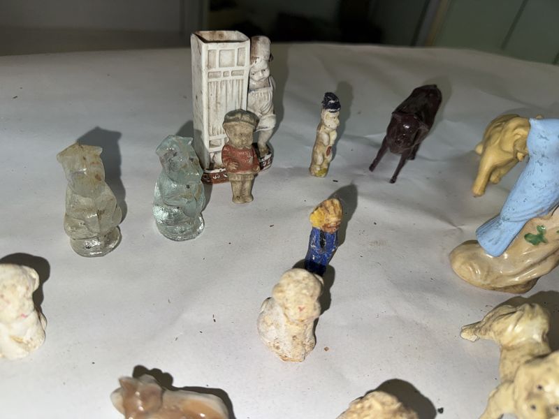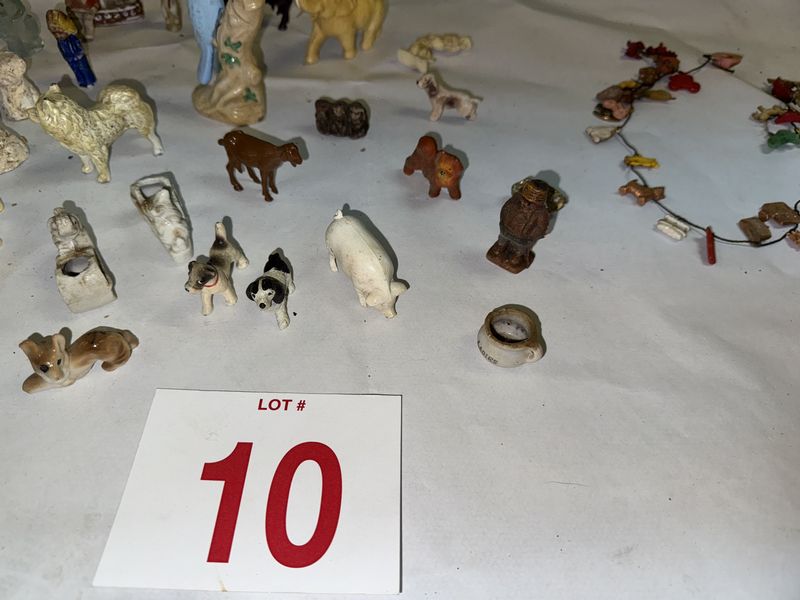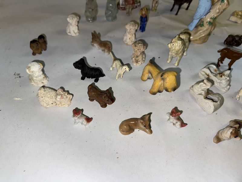 Glassware figurines. Some are cast iron (Hubley?), some glass, some are damaged, see photos sold as is.