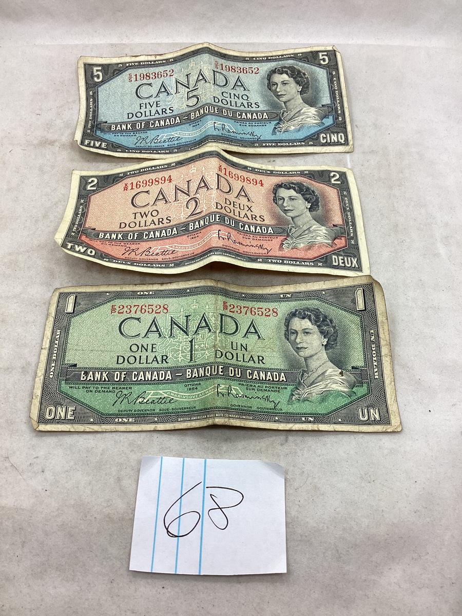 A five dollar bill a two dollar bill and a one dollar bill All 1954 dated