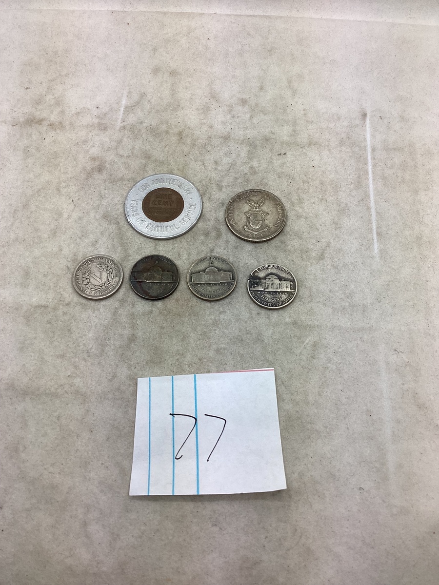 One barber, dime novelty penny, war nickel, and a foreign coin