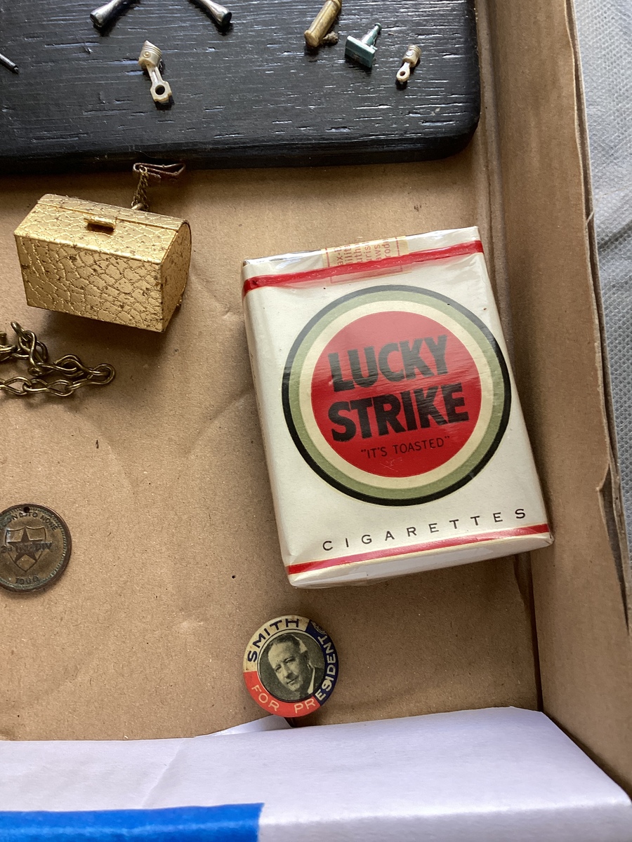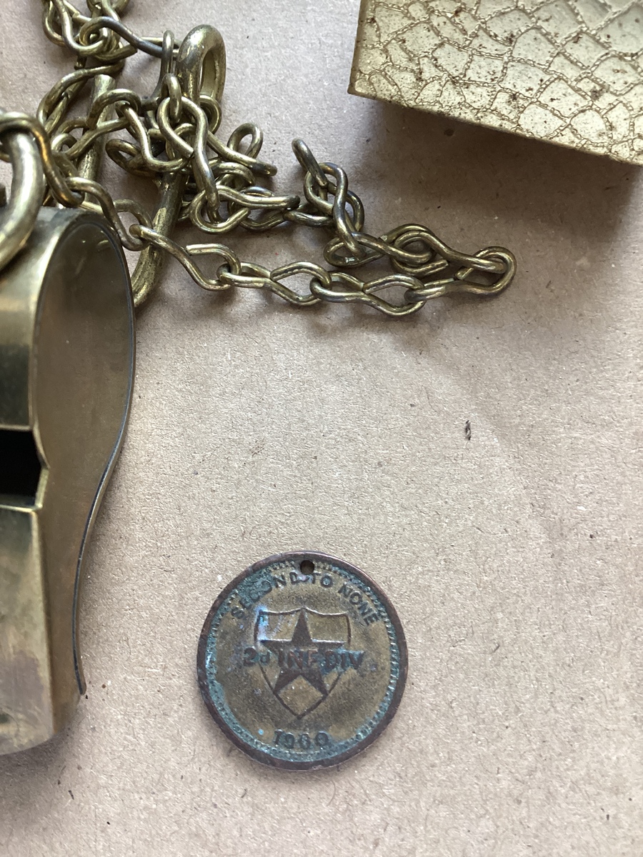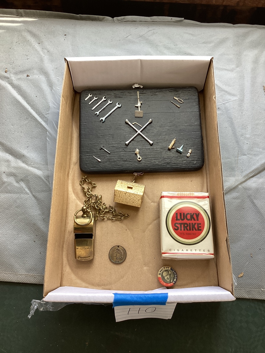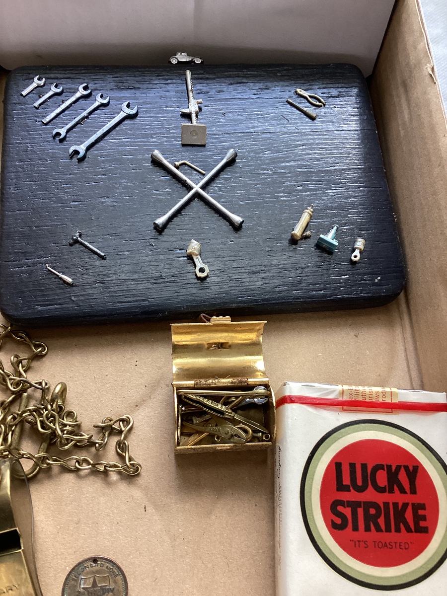 Miniature tools, military whistle, military token new old stock lucky strikes