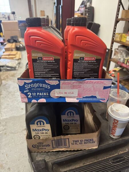 3 quarts 5W-30 synthetic blend oil, 1 quart 5W-40 synthetic oil, 1 quart 0W-20 synthetic oil, 11 quarts 5W-30 Mopar engine oil, 2 quarts 5W – 50 Castrol edge motor oil.