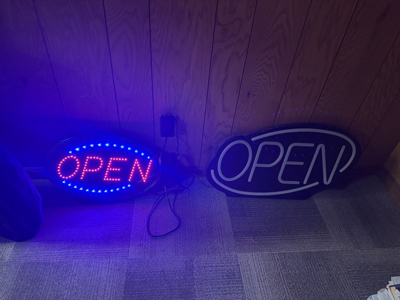 Two open signs one working condition the other needs repair two signs one money