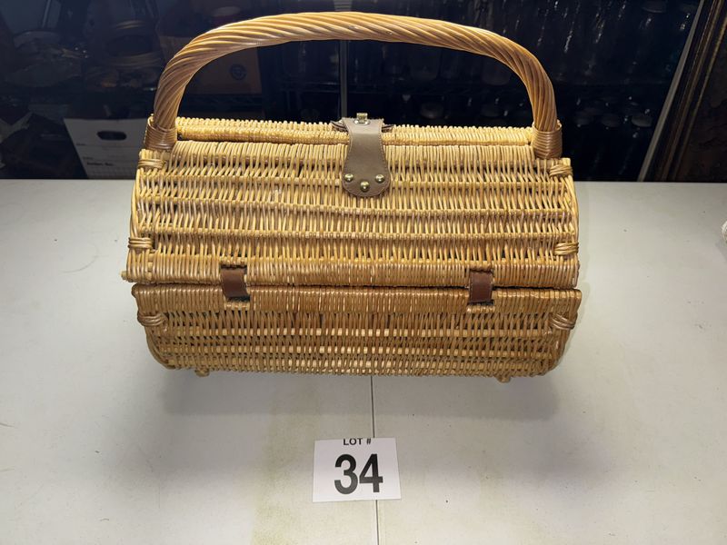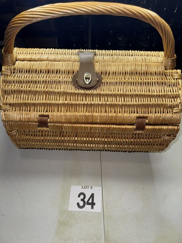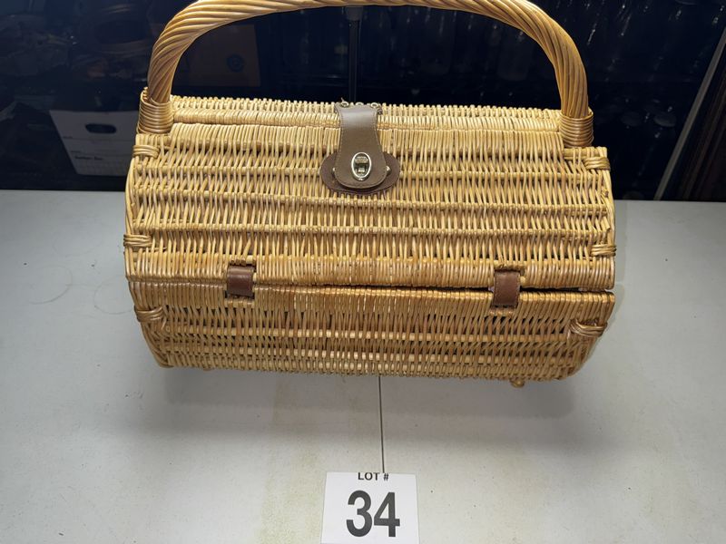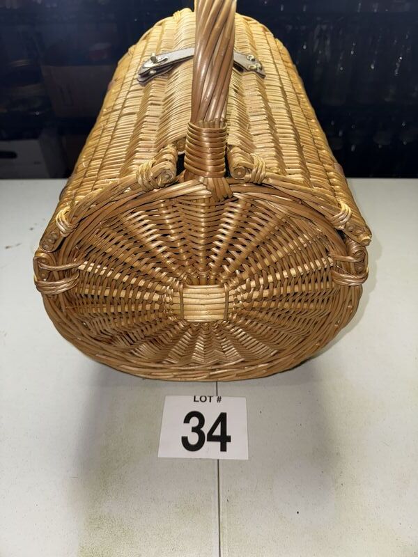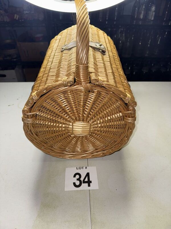 Wicker picnic basket with contents see photos sold as is
