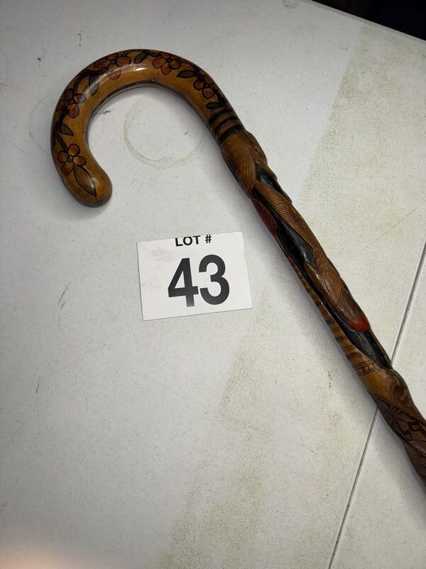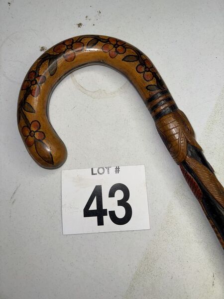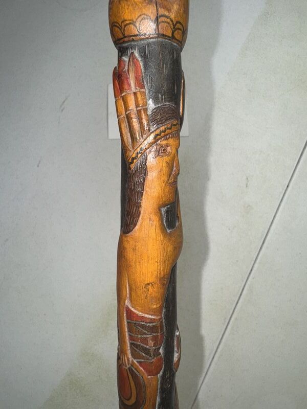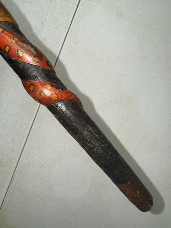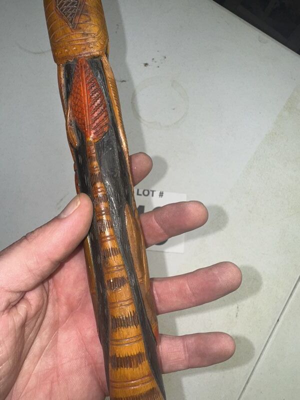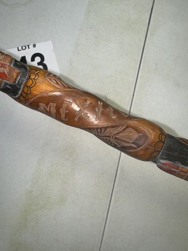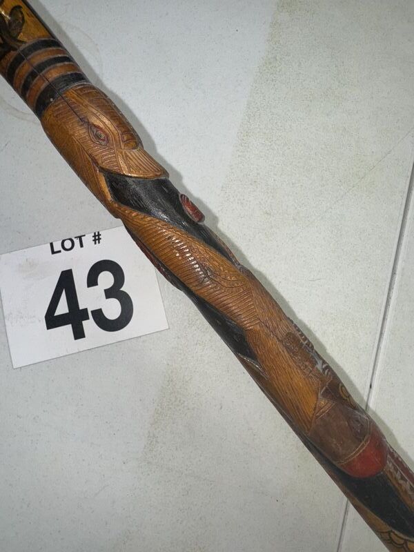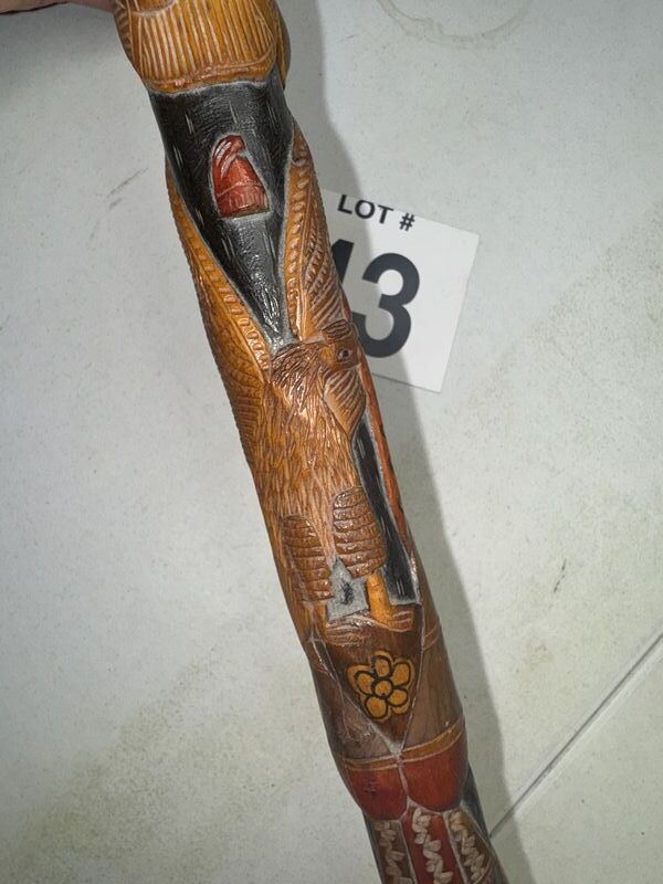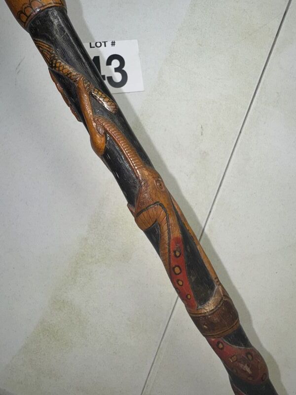 36 inches Hand carved with snakes native American eagle. Some cracking in the cane see photos sold as is.