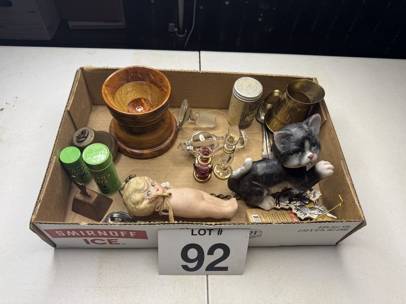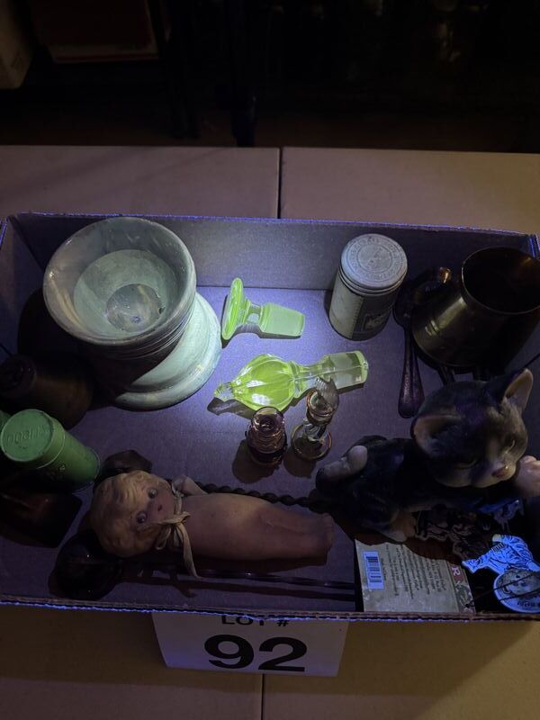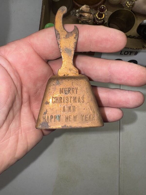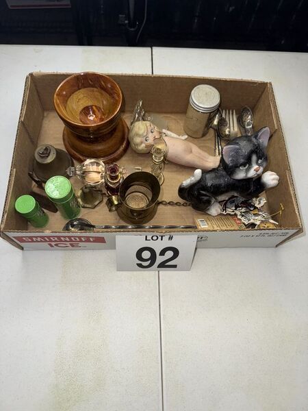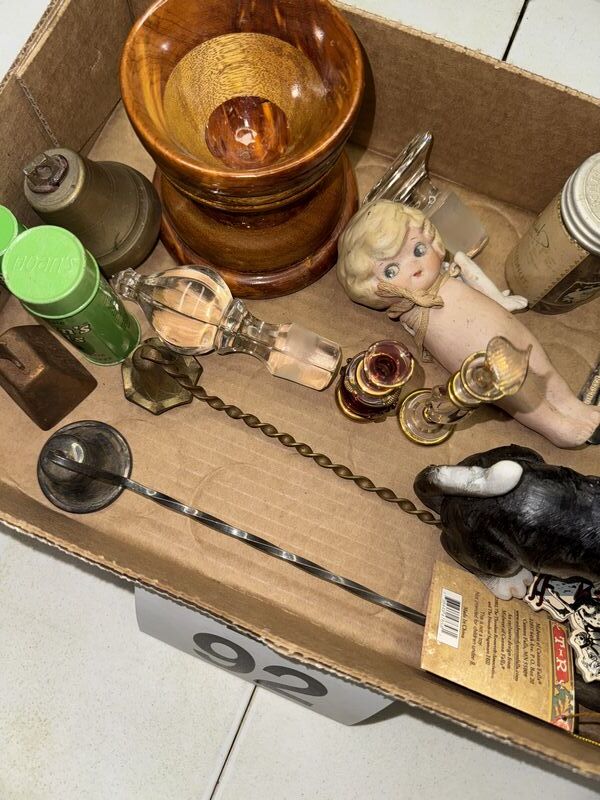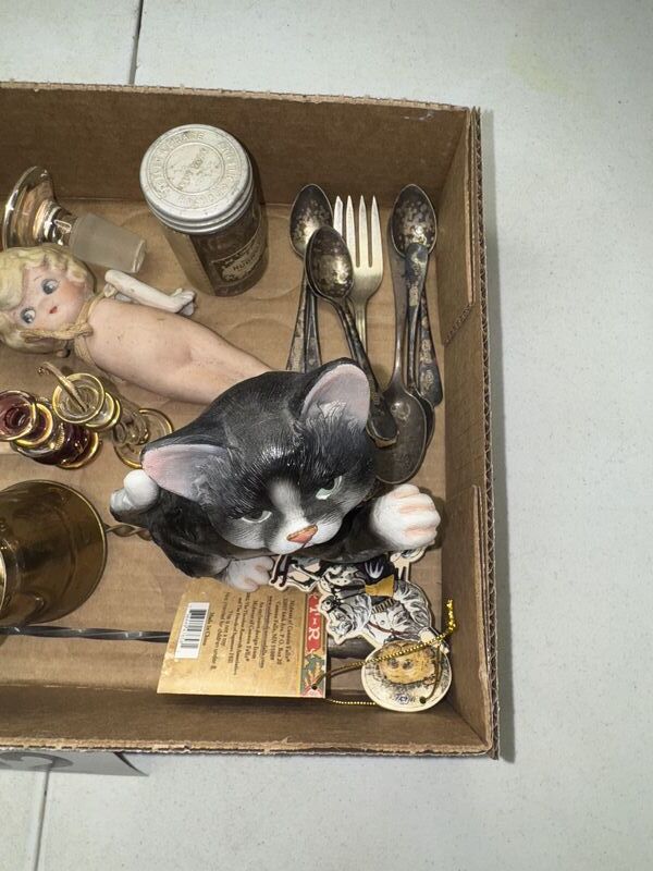Advertising, bells, figure bottle, opener, candle, snuffers, bobble, head, cat, silver plate, silverware, perfume, bottle, bottles, and manganese bottle toppers see photos sold as is