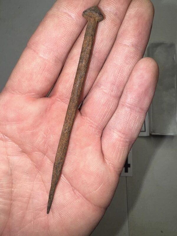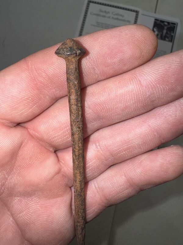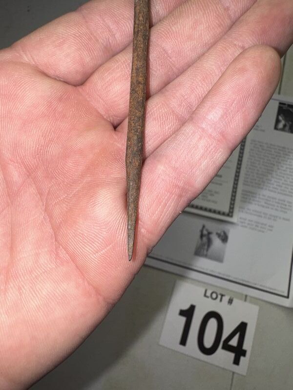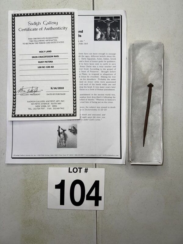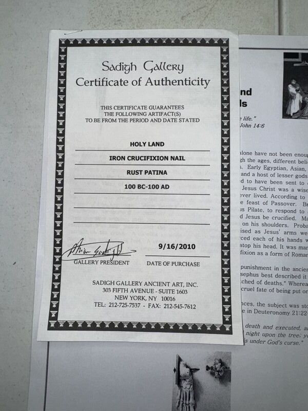 Holy land, iron crucifixion nail with certificate of authenticity approximately 4 1/4 inches in length some rust and patina see photos sold as is