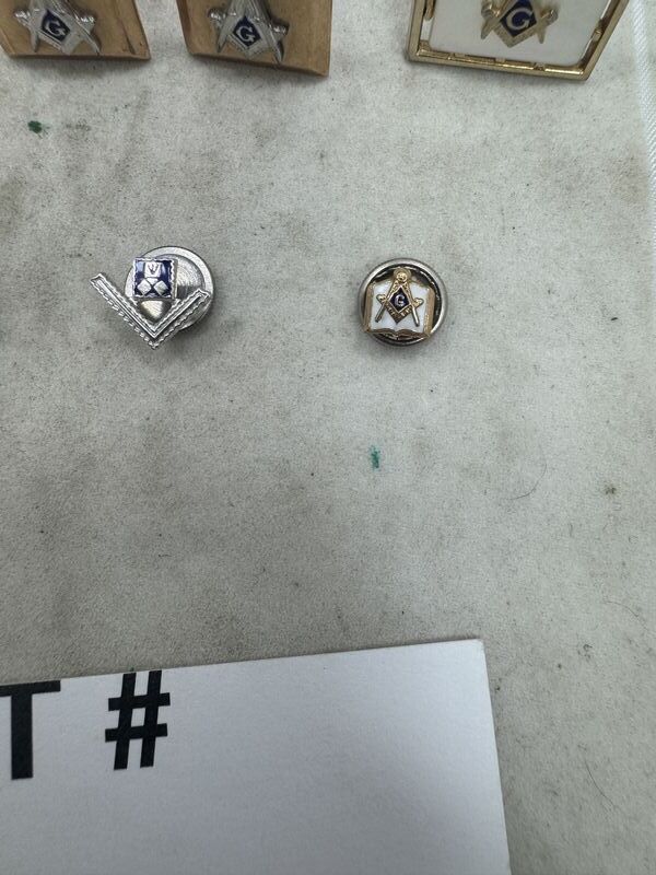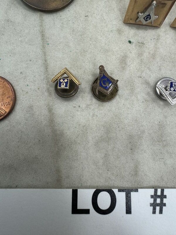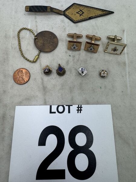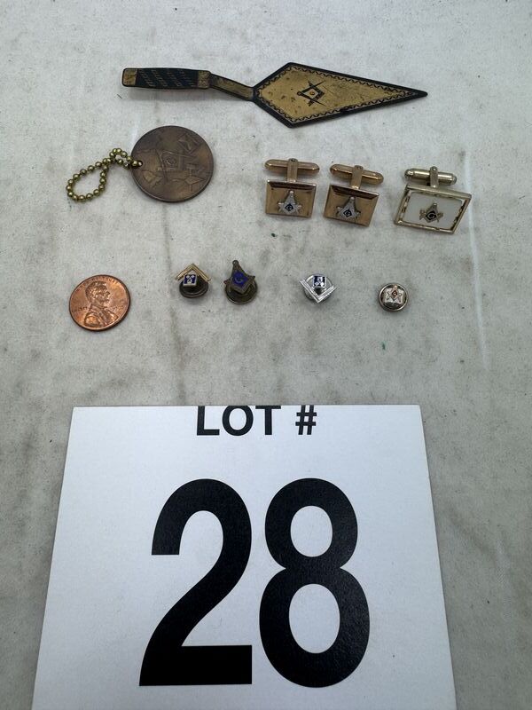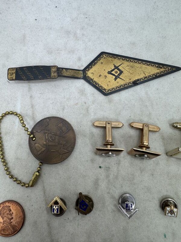 Pins, cuff links, coin, and pie cutter. One pin is marked 10k See photos sold as is