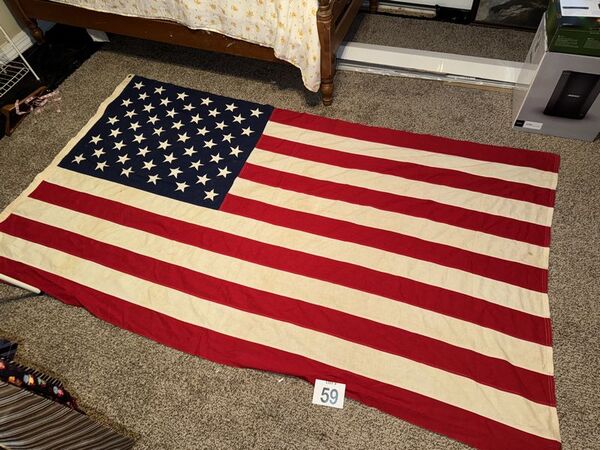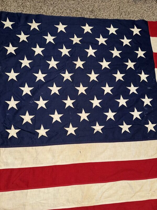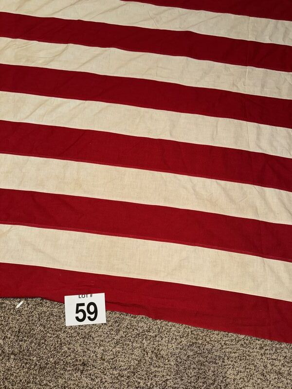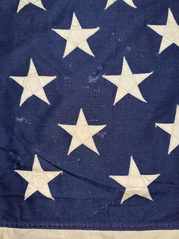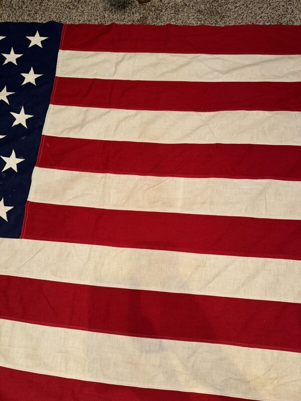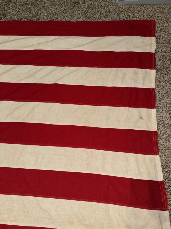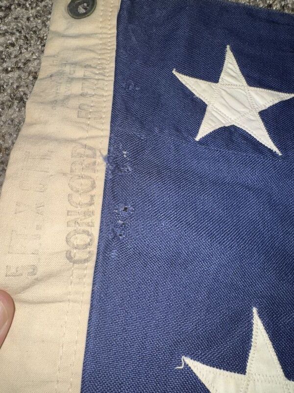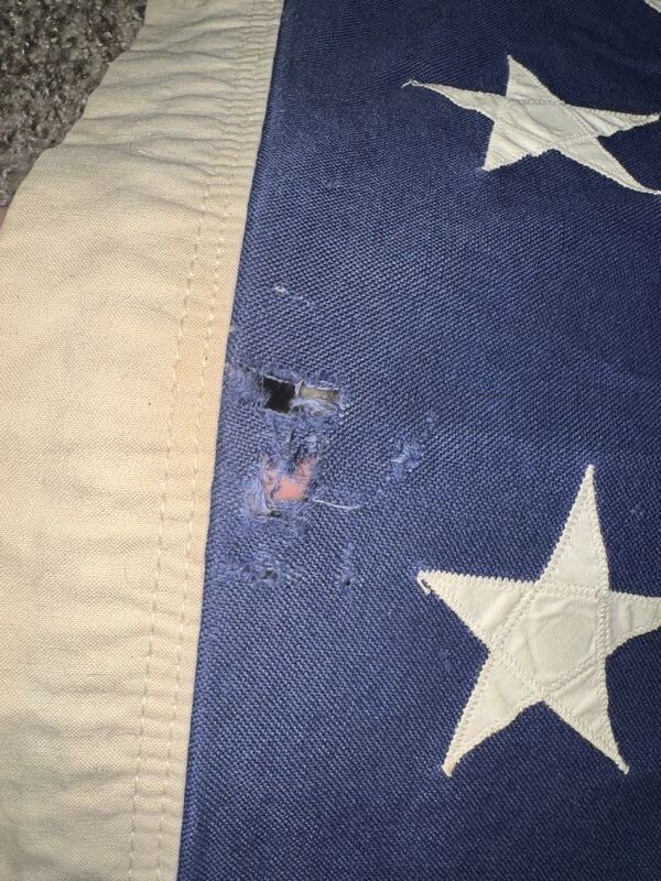 Hand zone stars and stripes there is some holes in the flag and some staining. See photos sold as is.