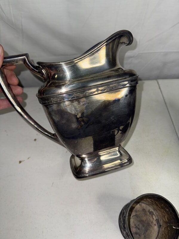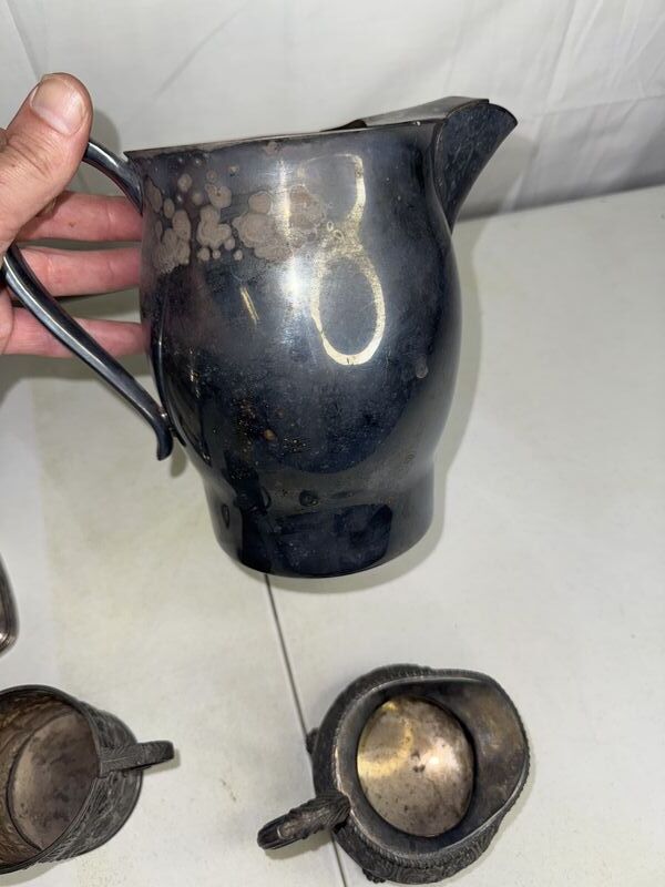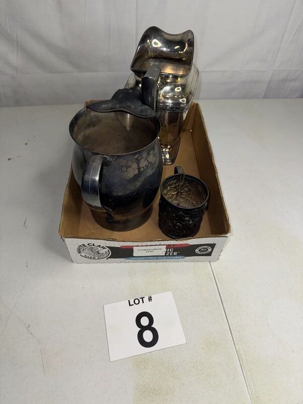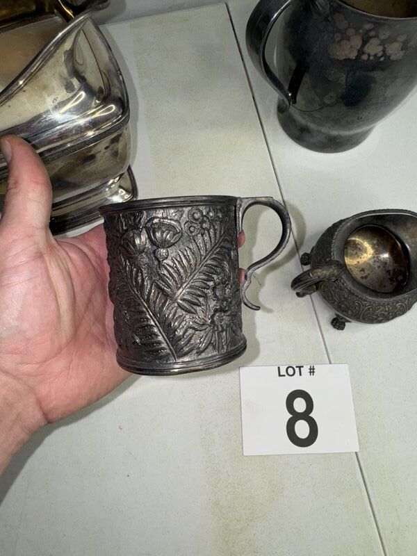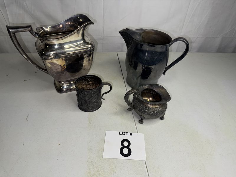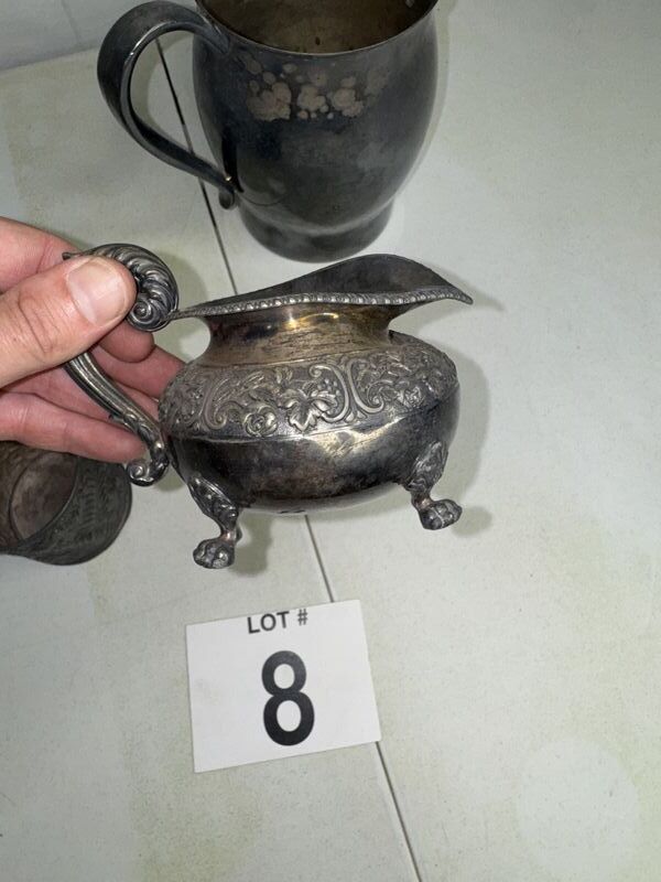 Silver plate lot, silver plate, pictures, silver plate cup mug with damage silver plate creamer. See photos sold as is.
