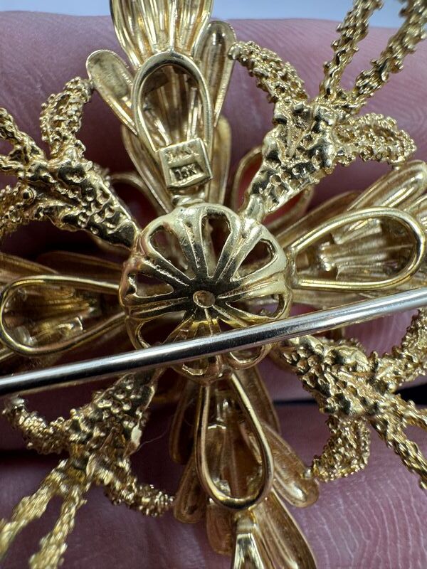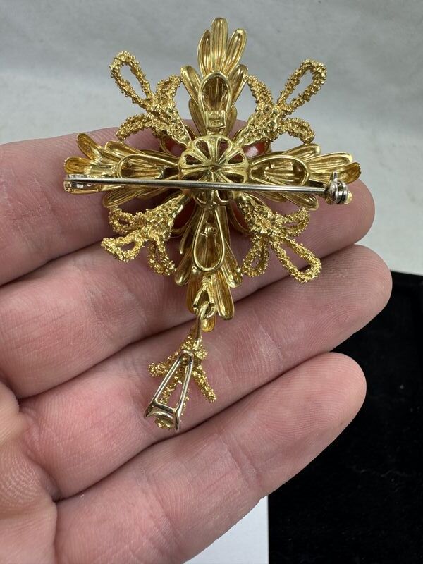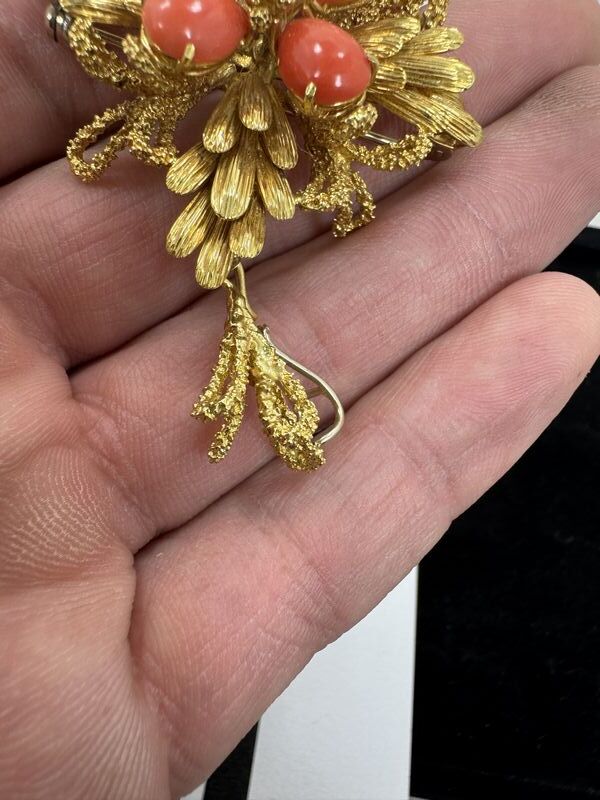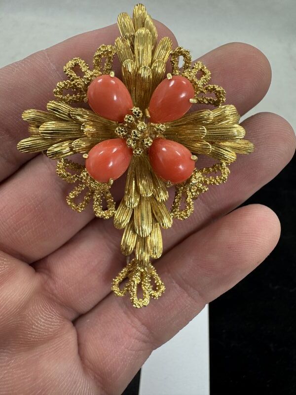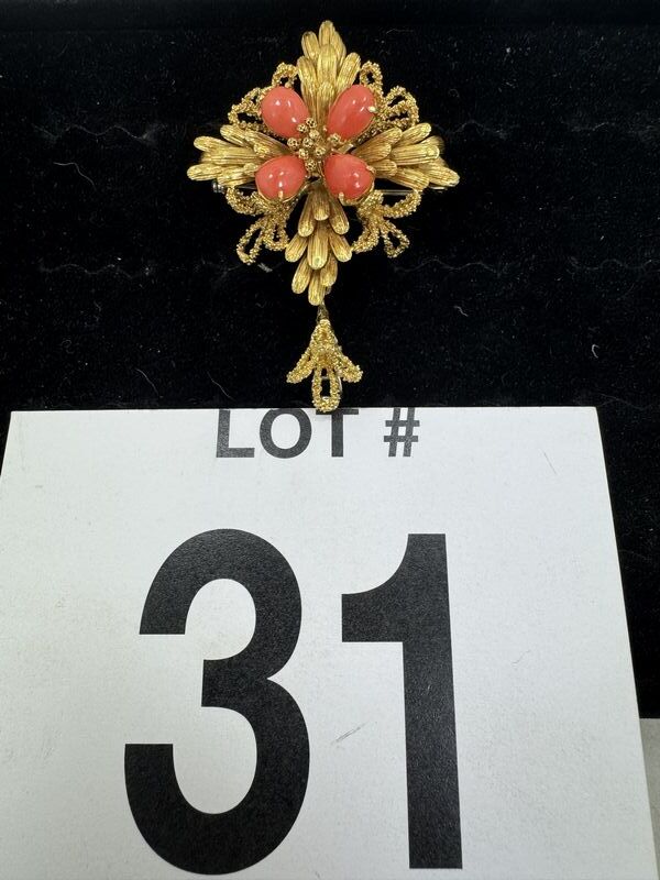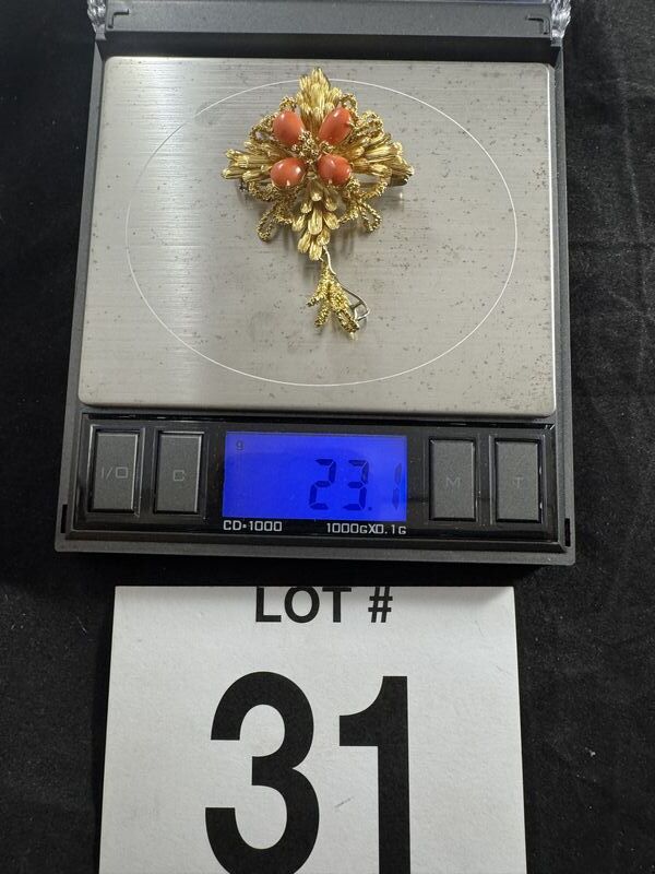 18K 23 gram Italy brooch with coral gems. See photos for description sold as is.