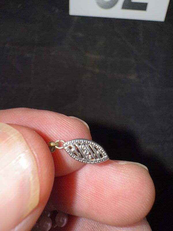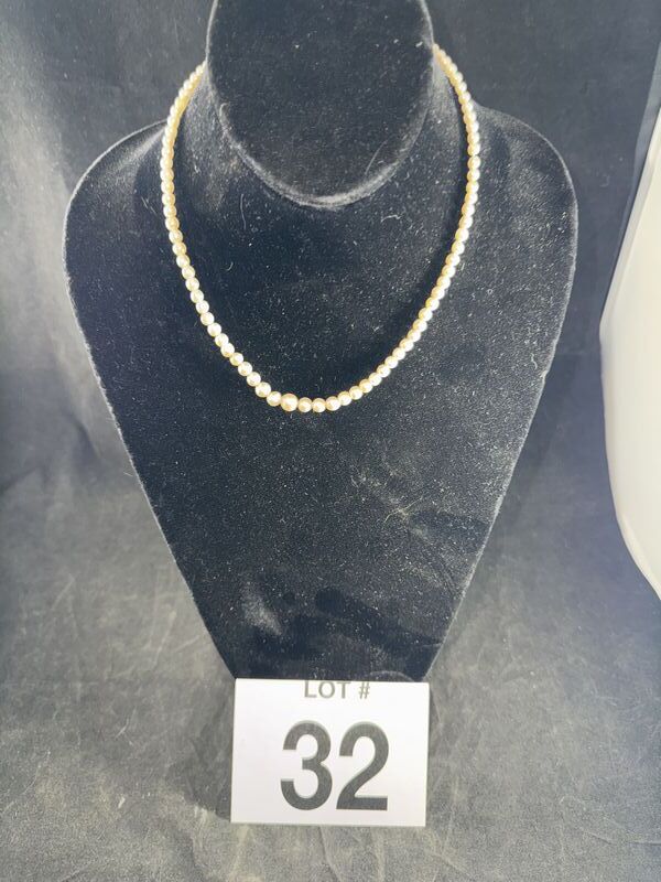 18 inch and length 10k gold clasp, pearl necklace. See photos sold as is.