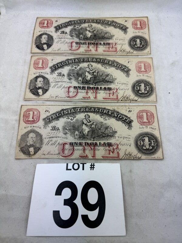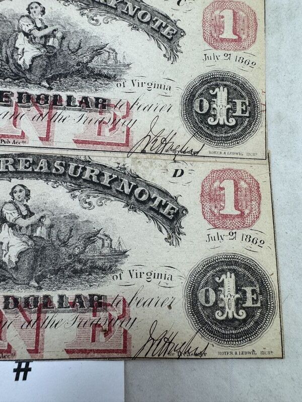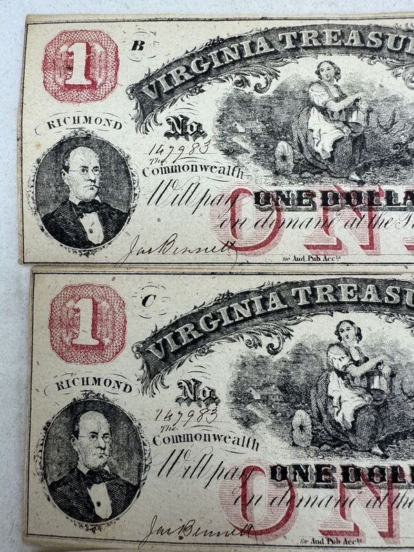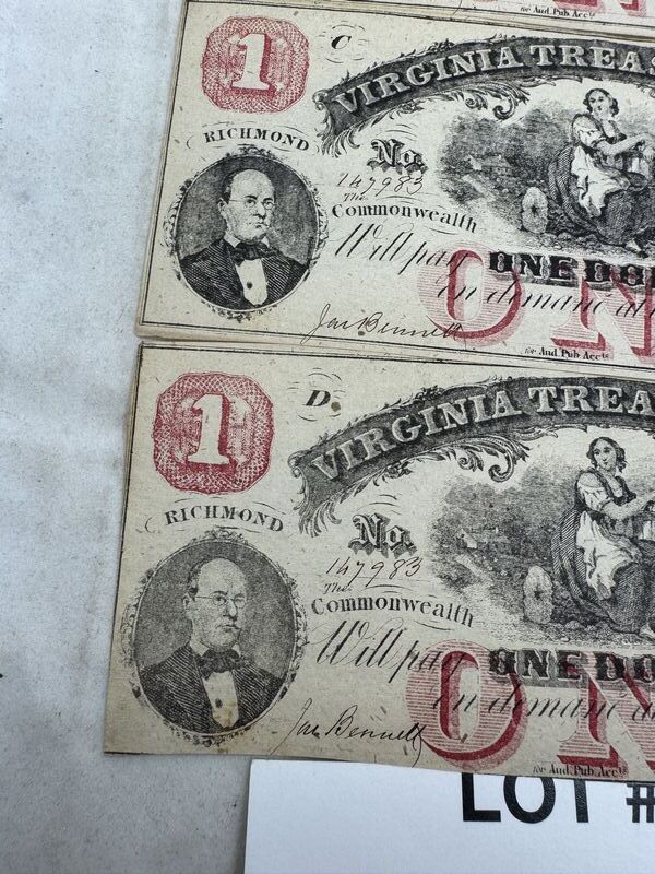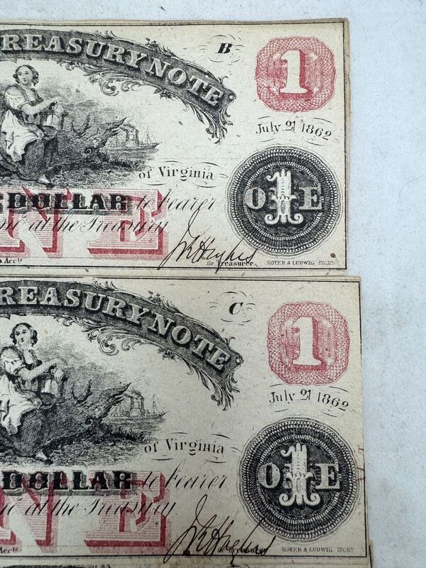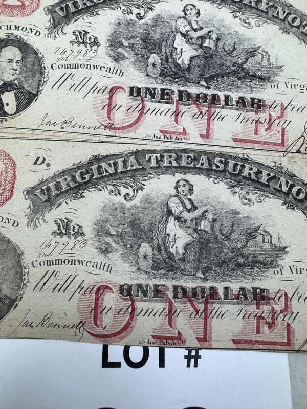 Authentic Virginia treasury one dollar notes 1862. See photos for condition sold as is.