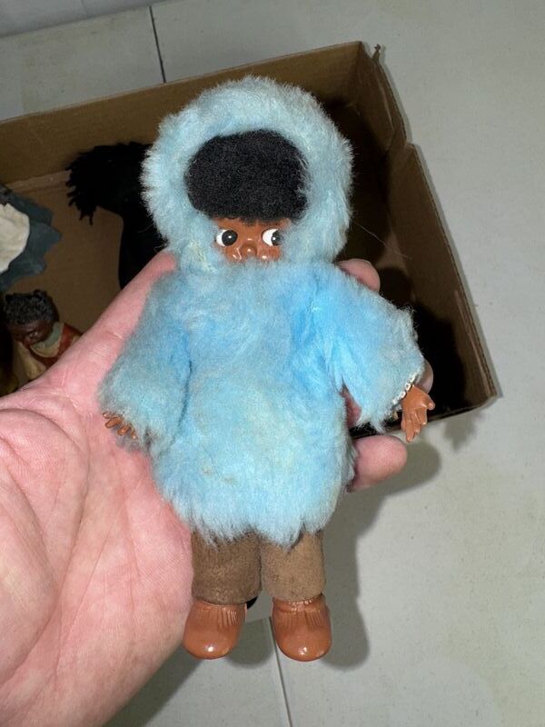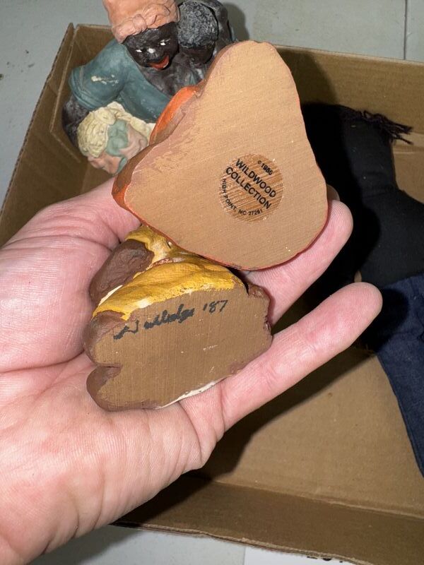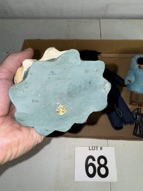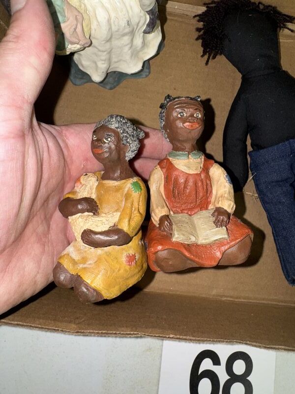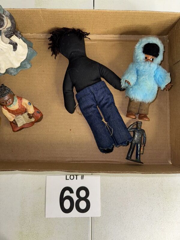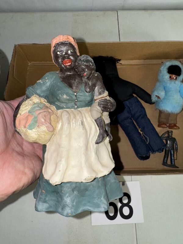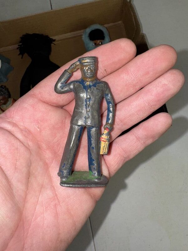 One lead figurine, one children’s rattle, and three figurines see photos sold as is