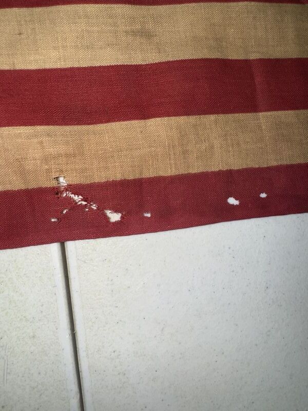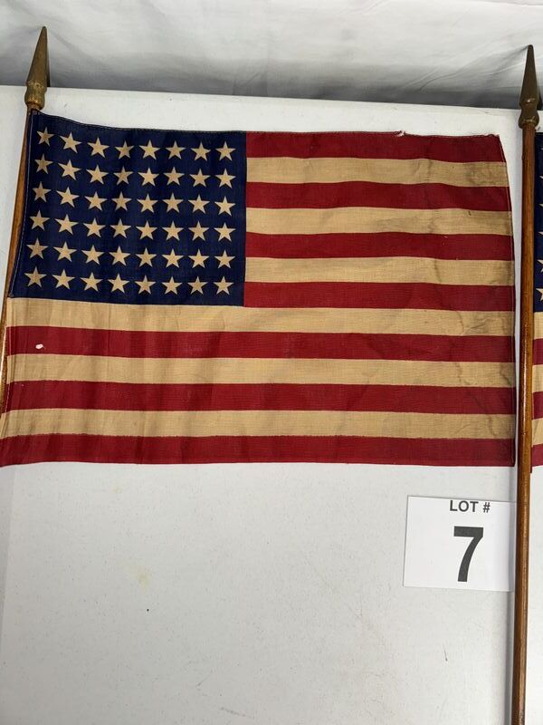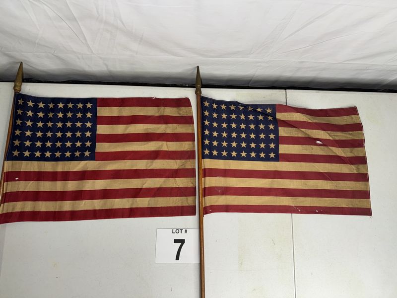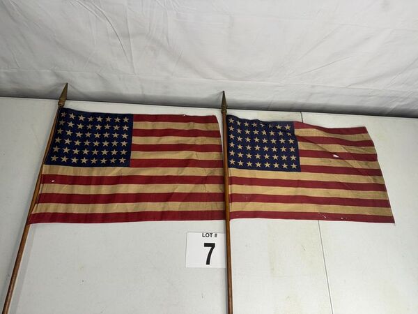 Both have some frayed ends. One has two holes both on sticks. Both flags are 16” x 12” see photos sold as is.