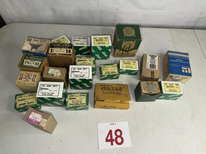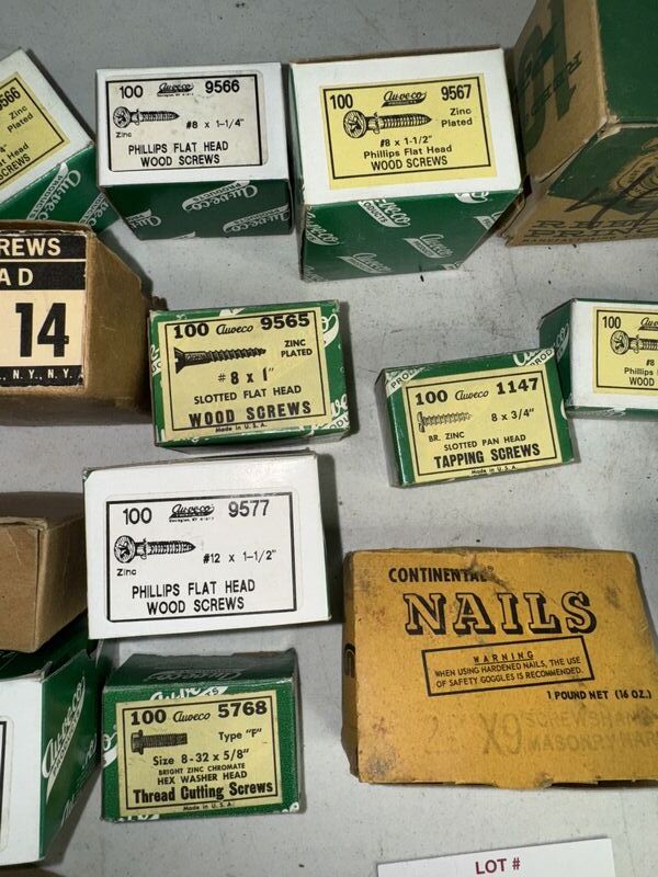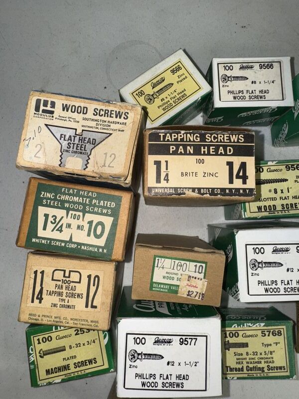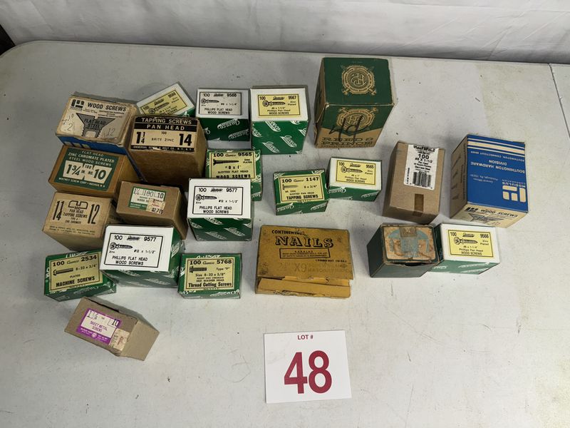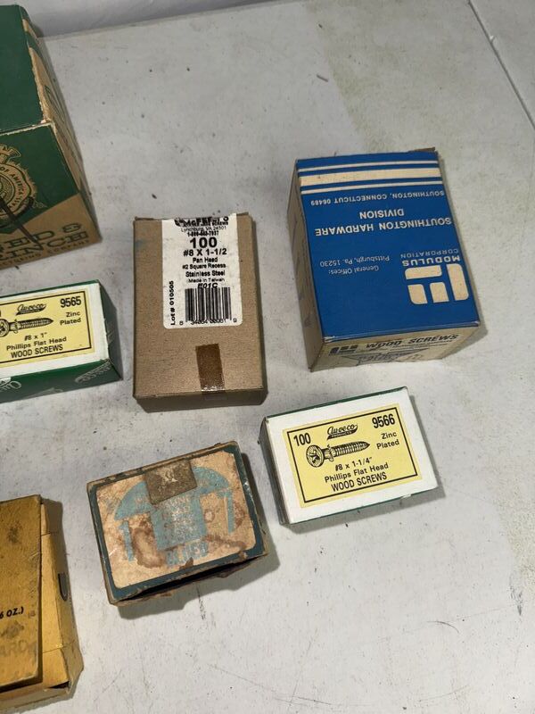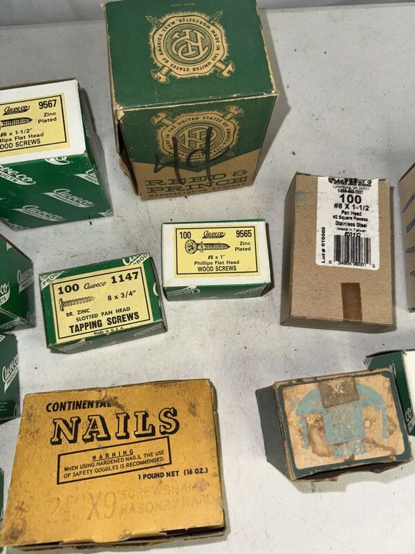 Various types of screws and nails see photos for description. All boxes are full sold as is.