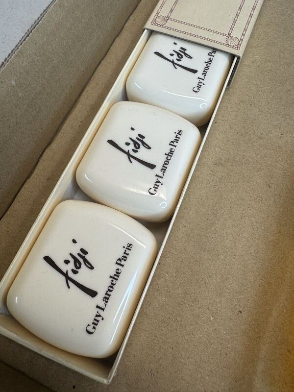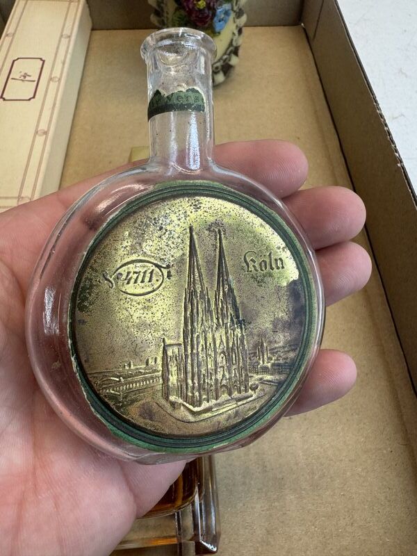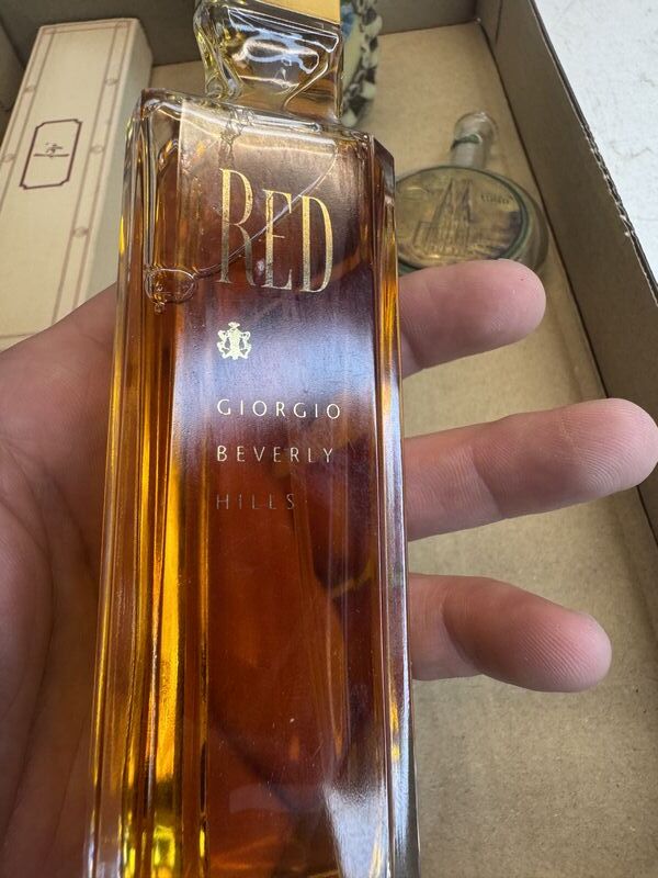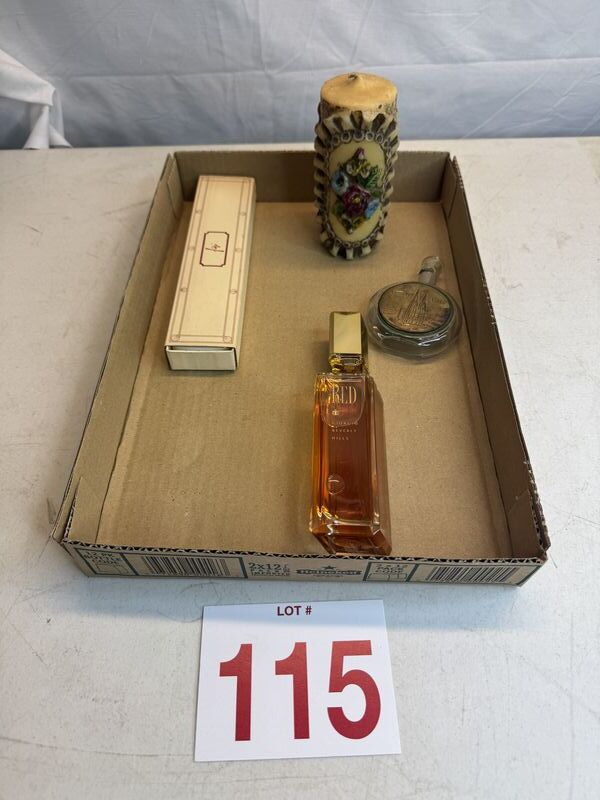 Two perfume bottles, one candle and sample soaps. See photos for description sold as is.
