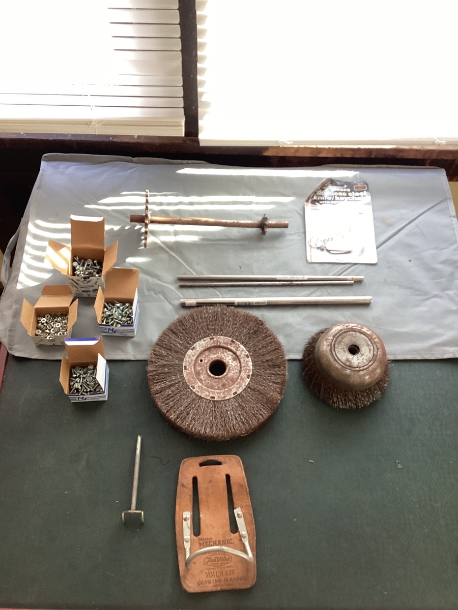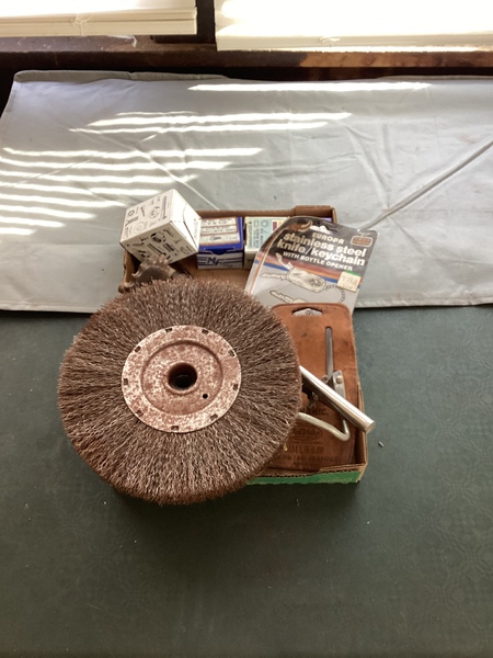 Tools, small engine parts, antiques and collectibles advertisement, a small assortment of items and goods for sale at this auction