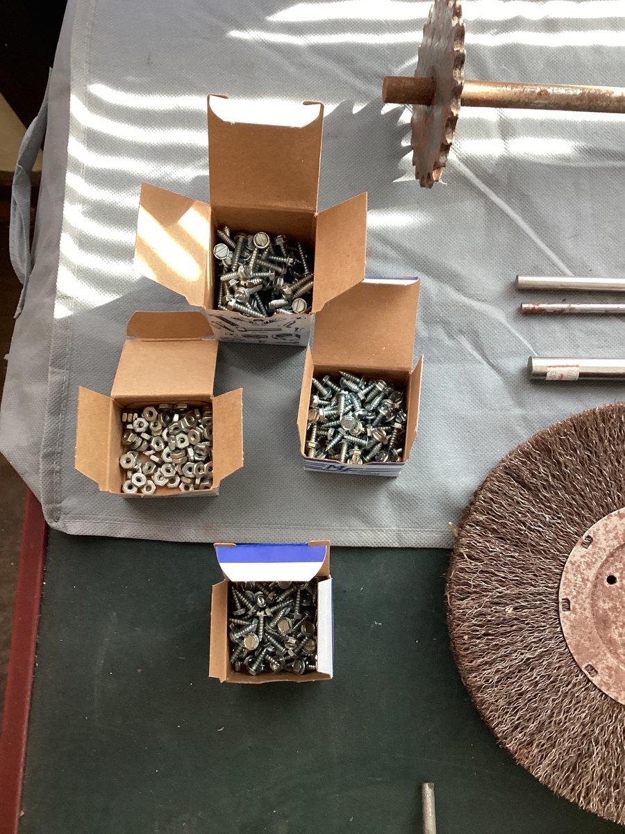 Two wired wheels, sprocket, stainless steel rods, nuts, and bolts in a box, keychain, and hammer holder