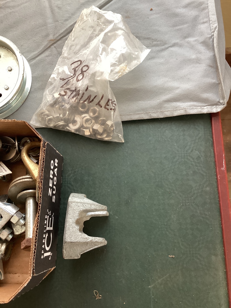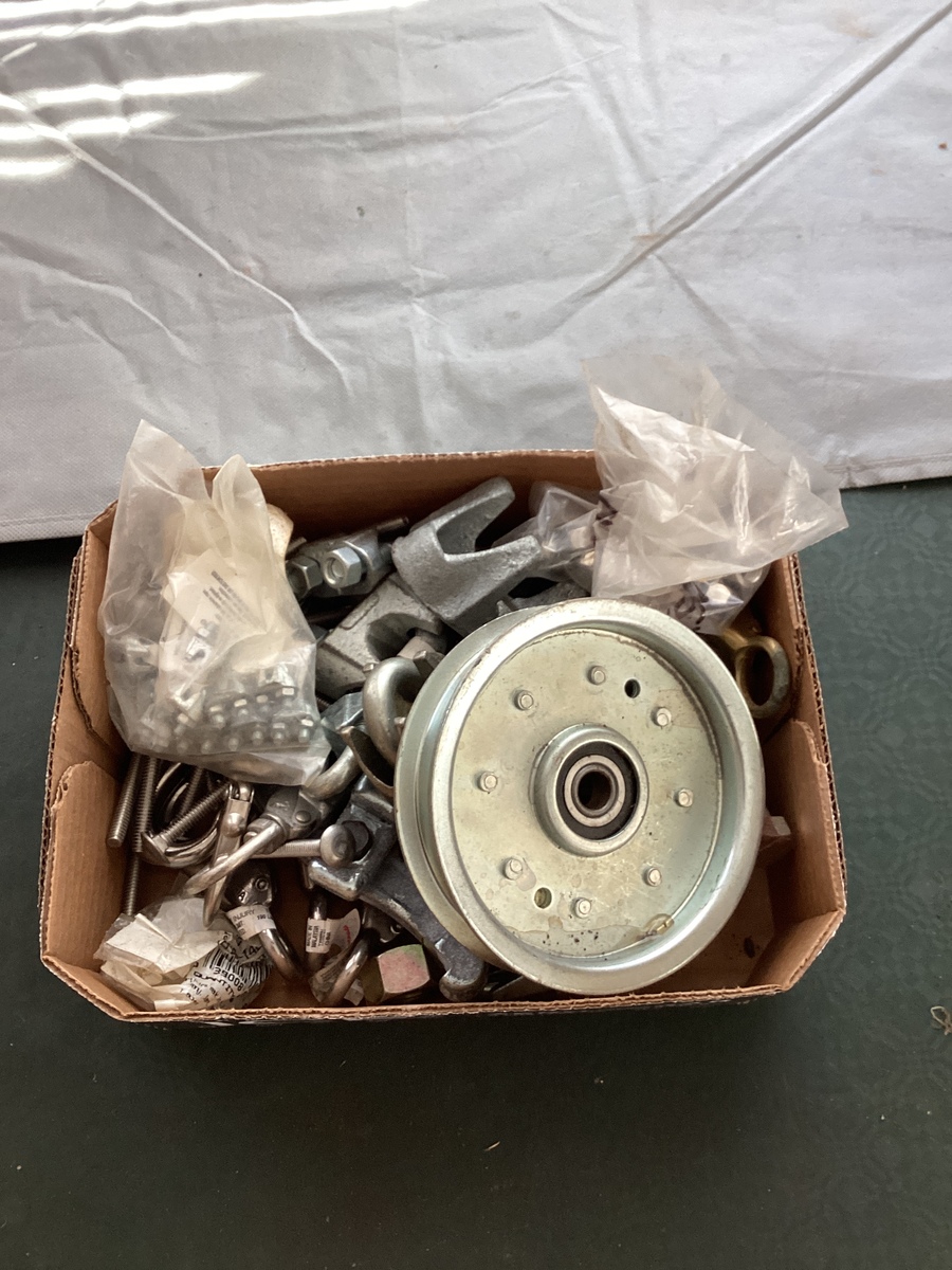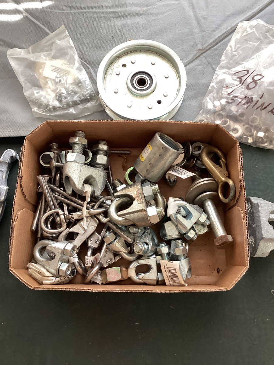 Various wire, rope, clips, and sizes, one pulley wheel, nuts, and bolts