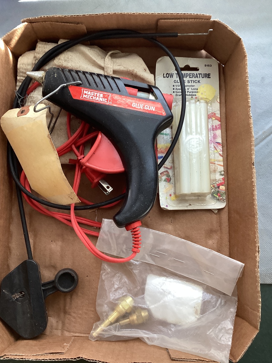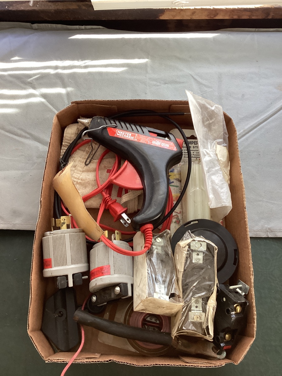 Various electrical parts, hot glue, gun, and hot glue sticks