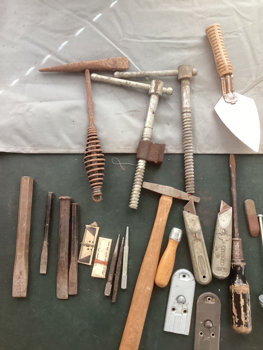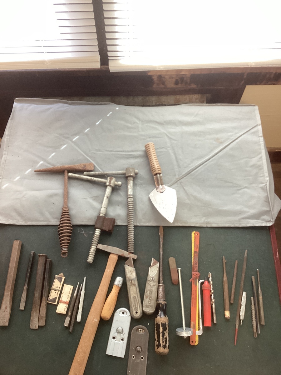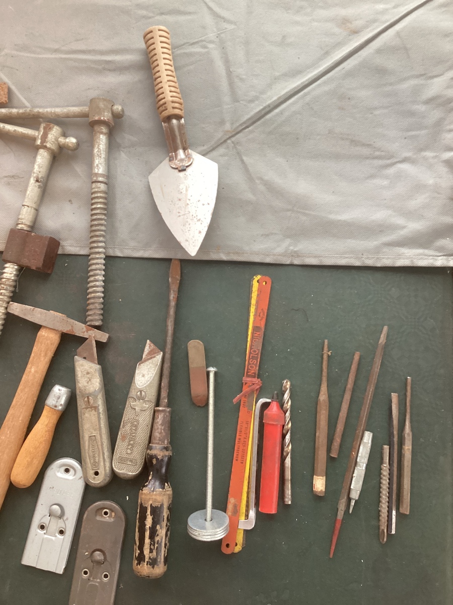 Tools, small engine parts, antiques and collectibles advertisement, a small assortment of items and goods for sale at this auction