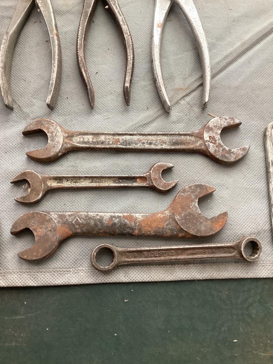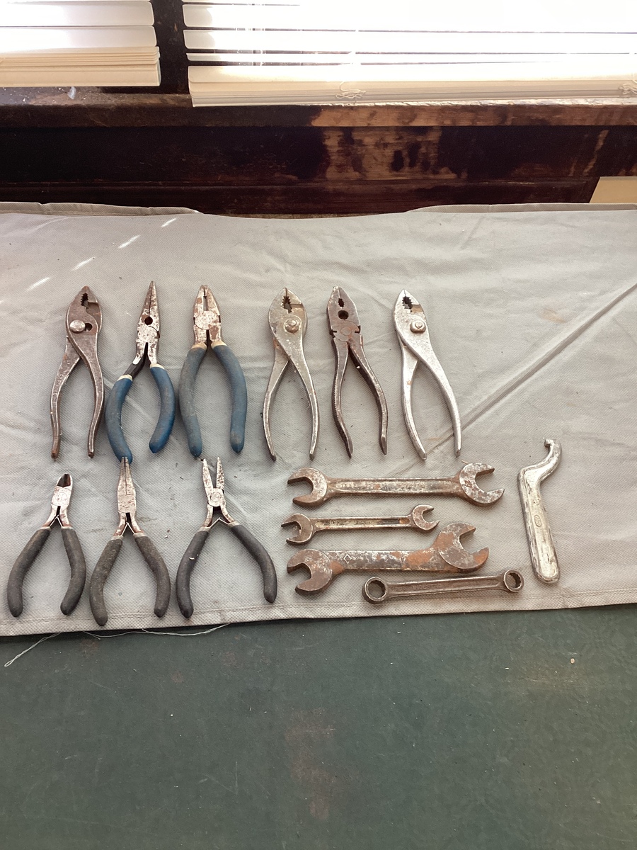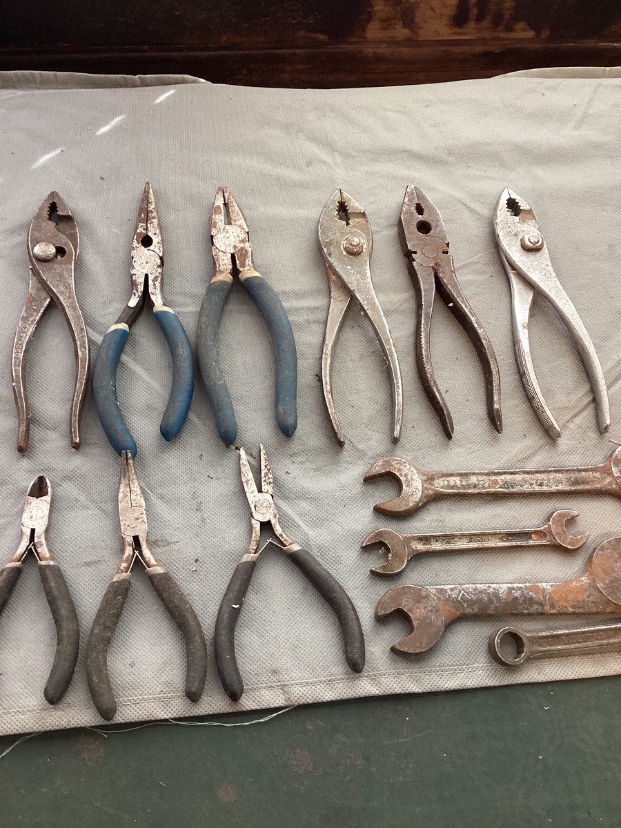 Four pair of pliers two pair needle nose, one bent needle nose ,four miscellaneous wrenches