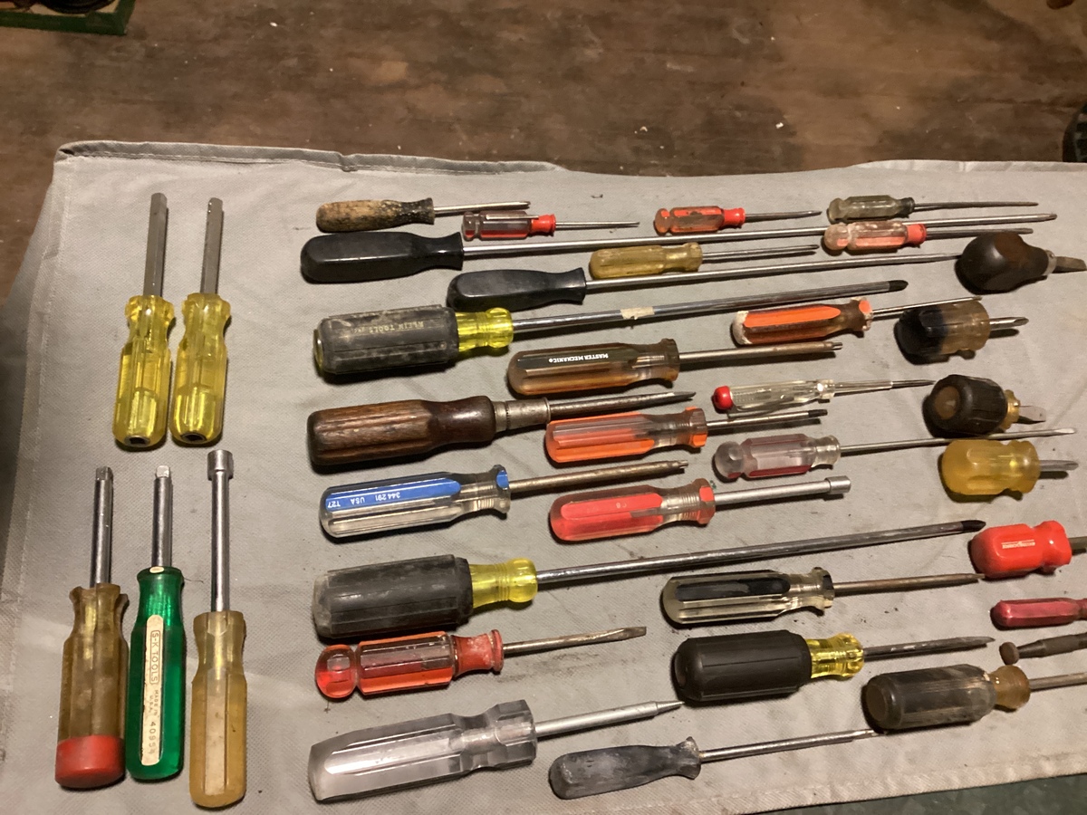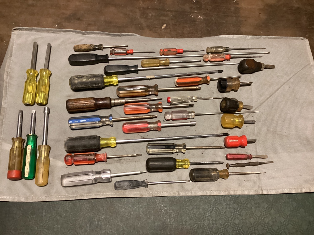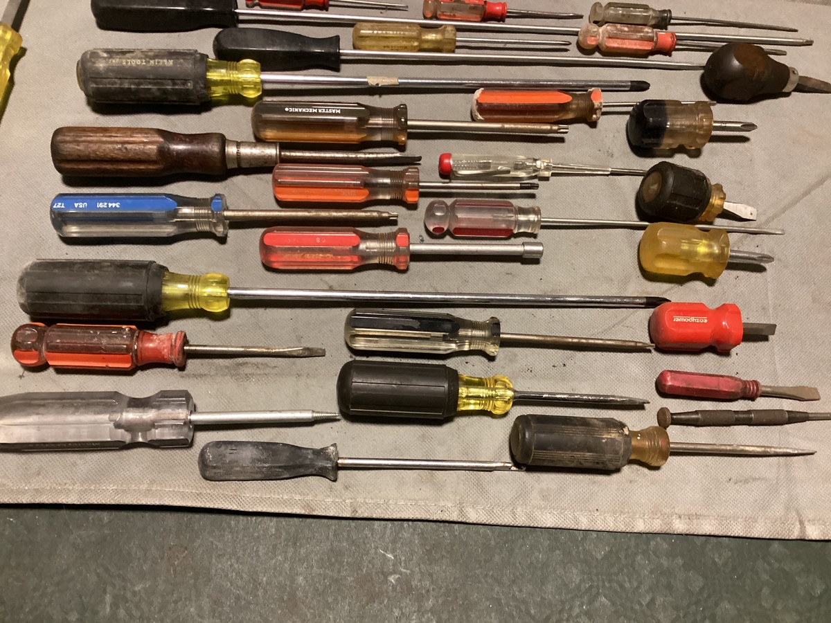 Flat heads Phillips, head socket ends various brands. SK Wayne craftsman, master mechanic Klein tools