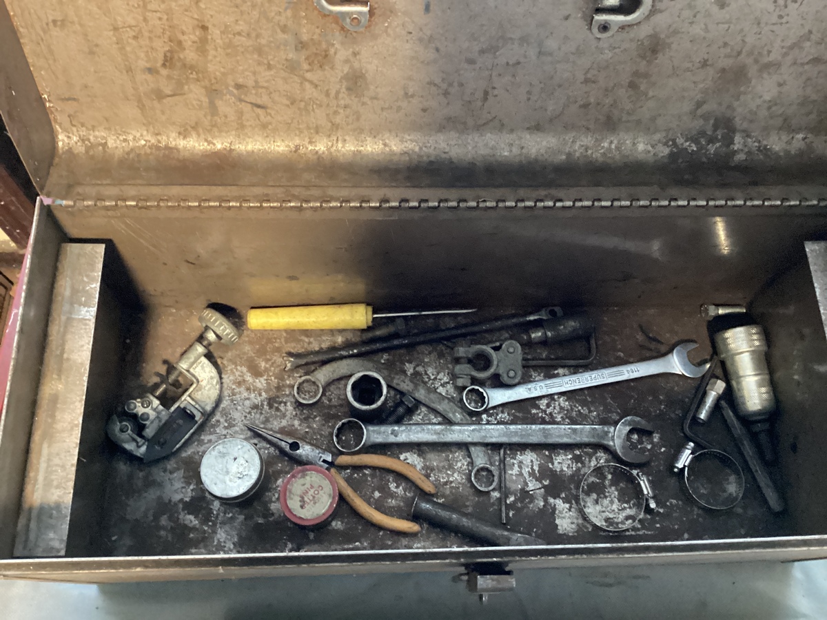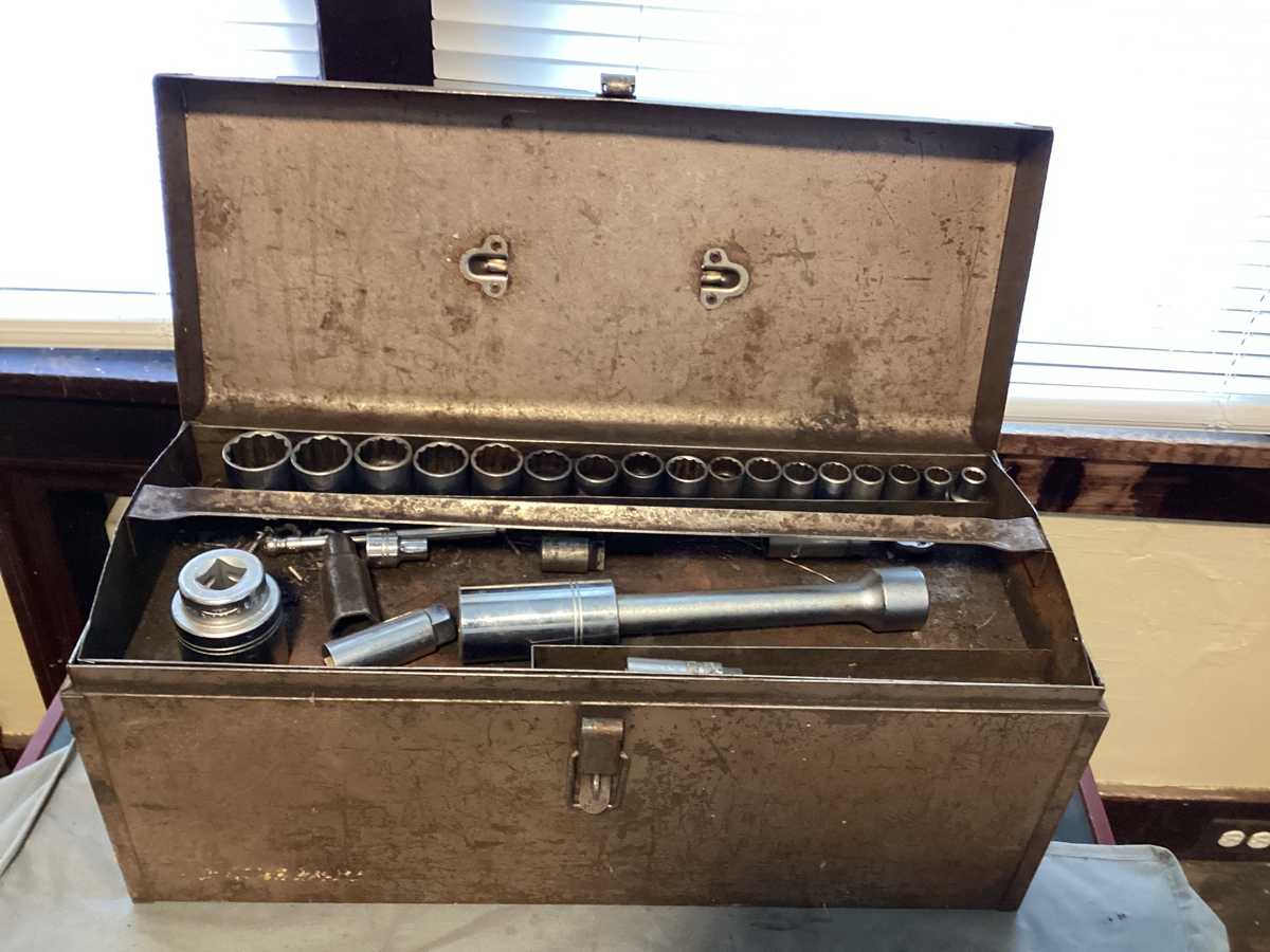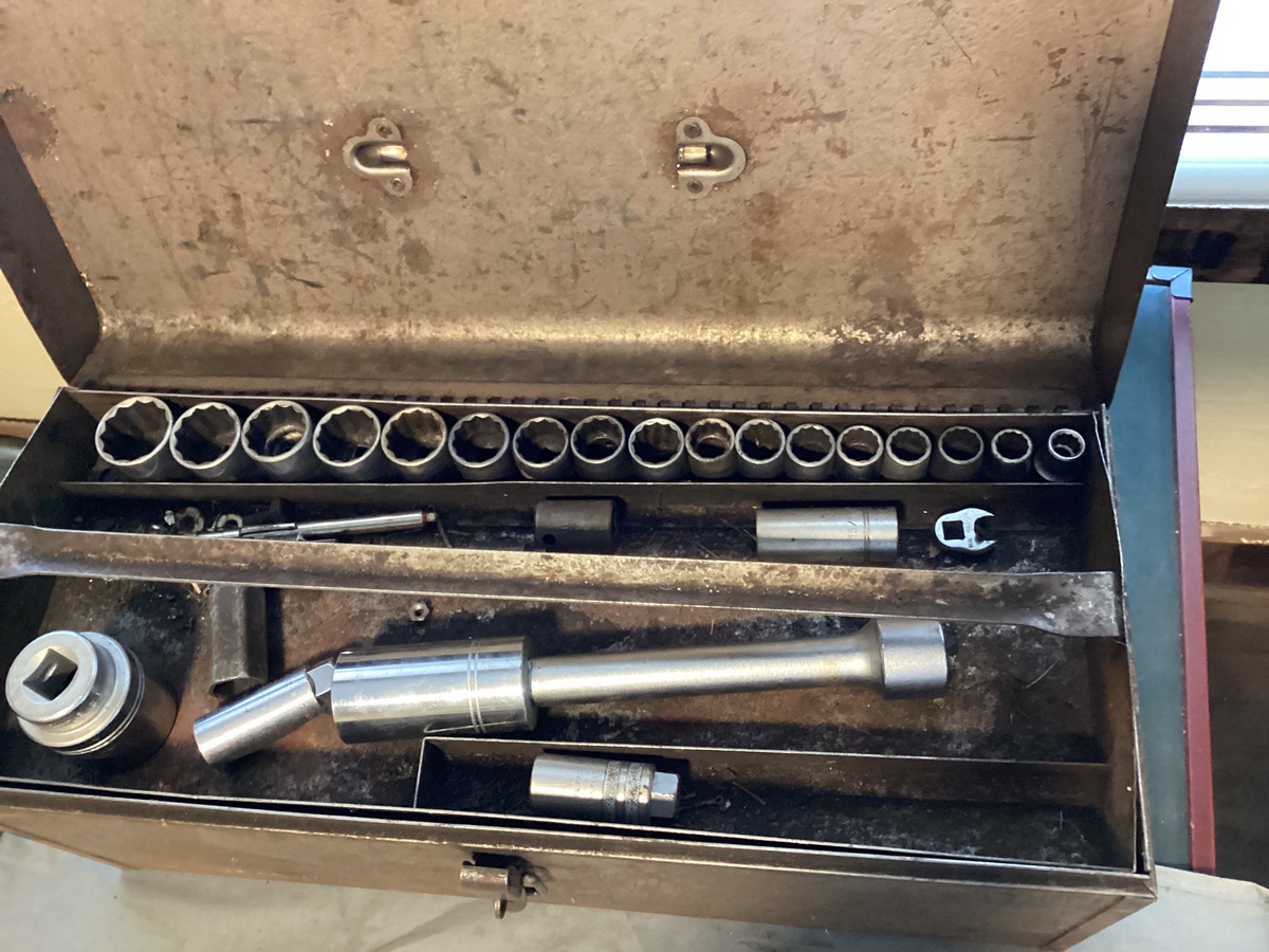 Sockets different brands, Williams craftsman new Britain husky Thorsen open and wrenches super wrench, terminal cleaner, cotter pins, pipe, cutter, needle, nose, pliers, other various handtools Removable tray