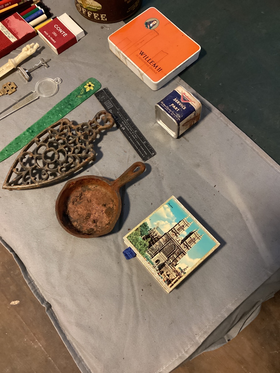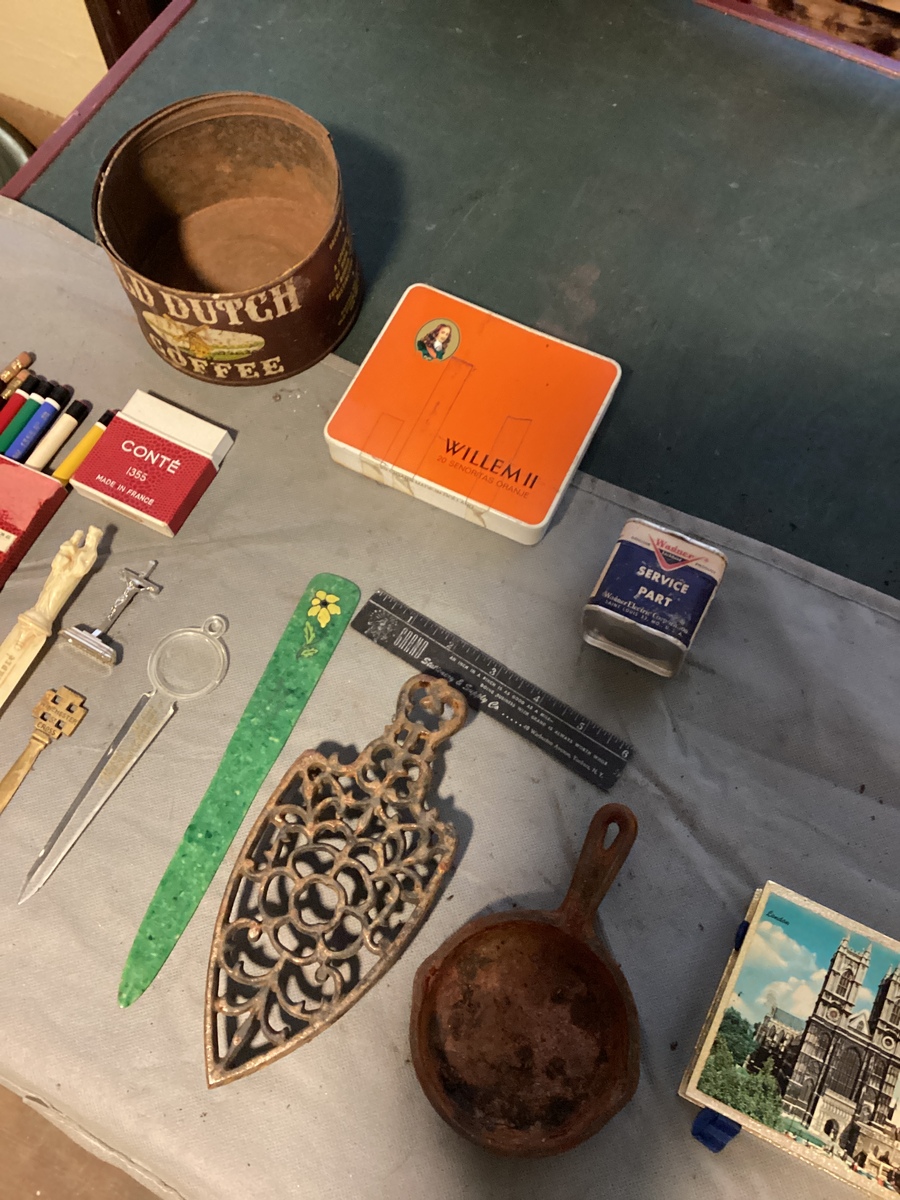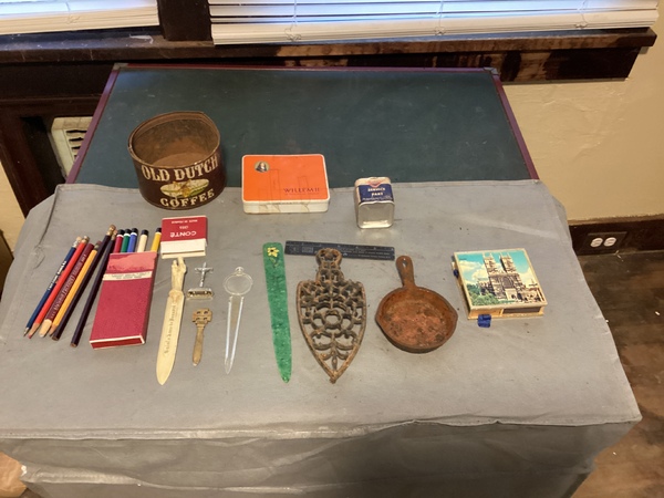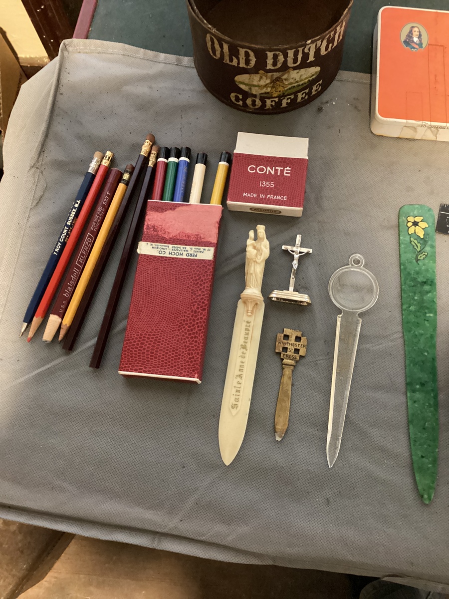 Various pencil, pens letter, openers old coffee, can old matches old ruler, mini cast-iron, frying pan, trivet, all as is.