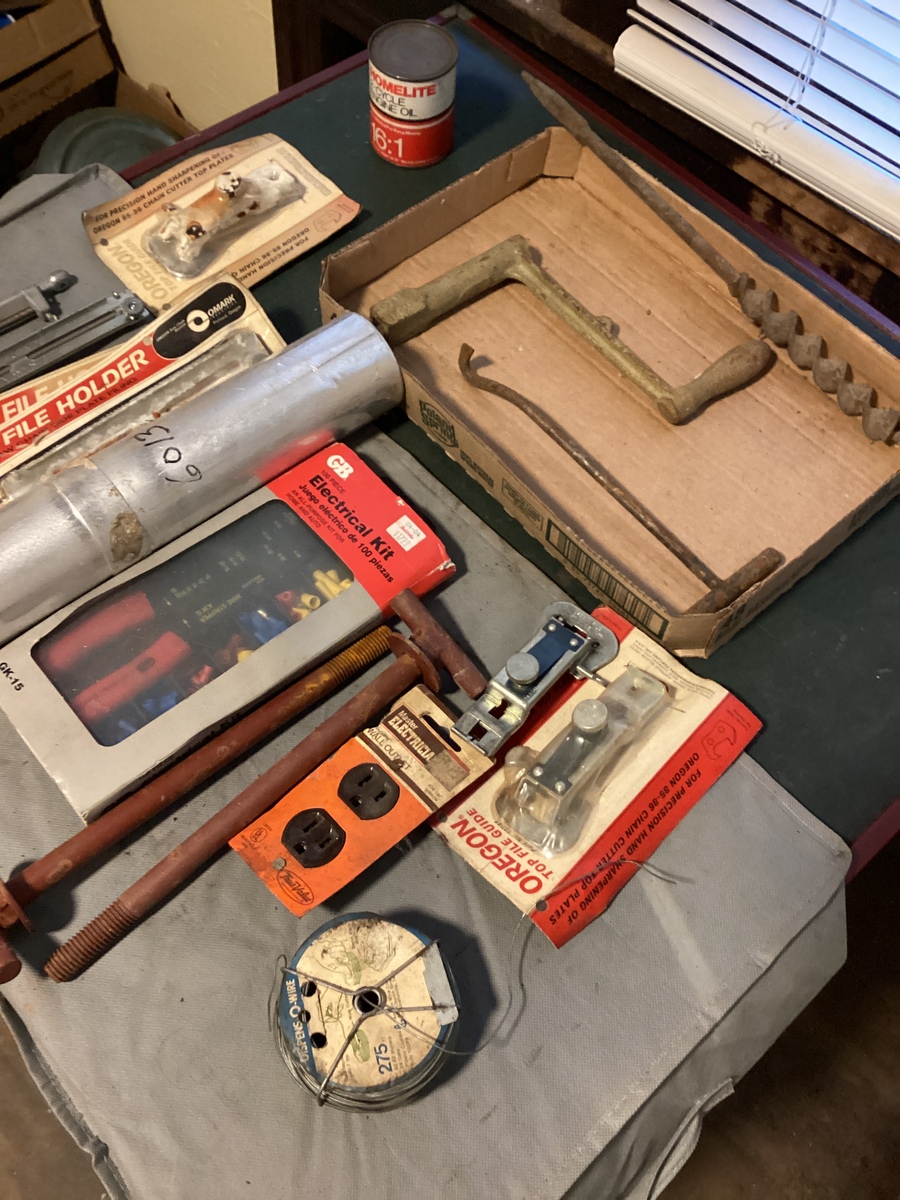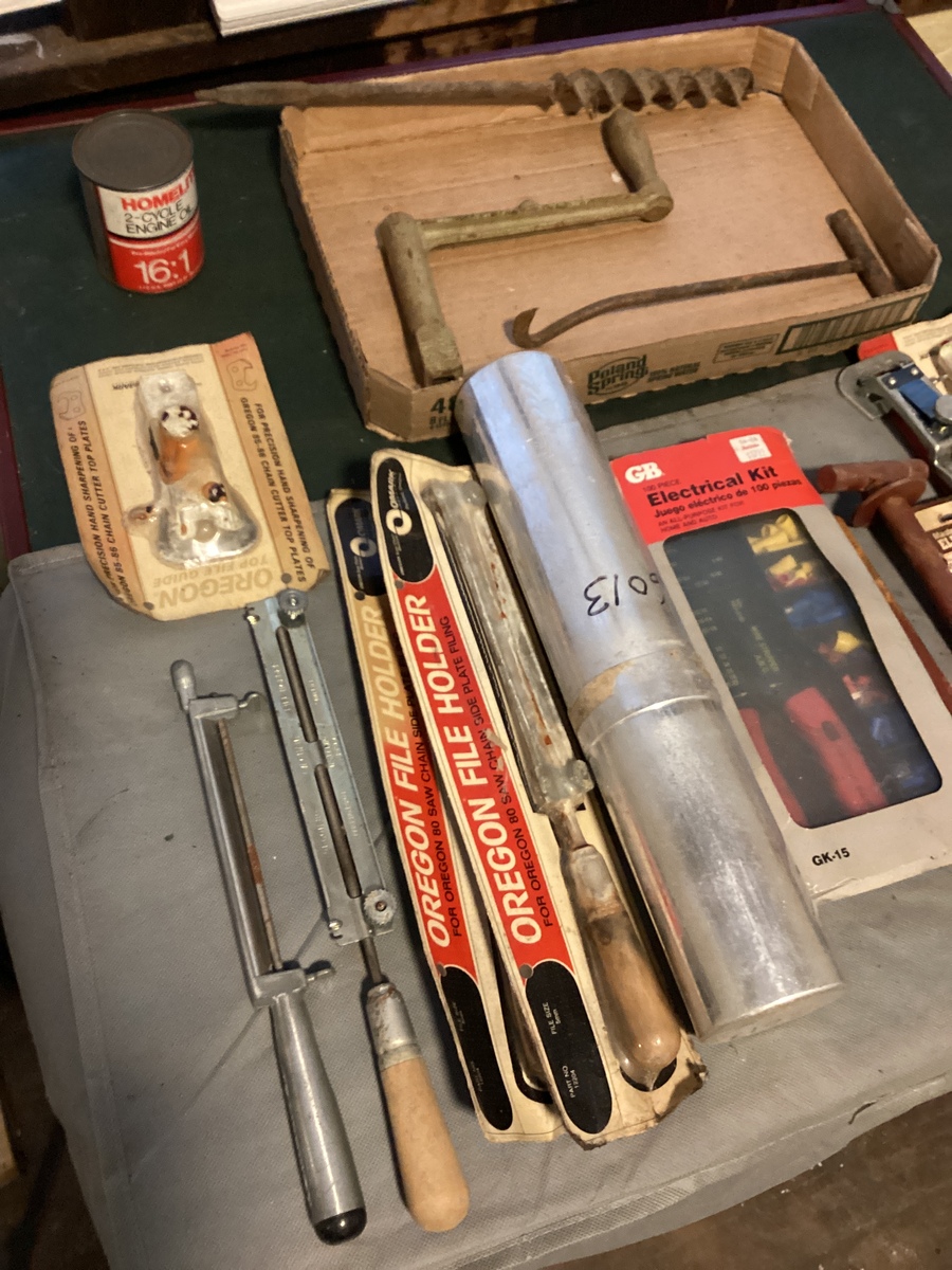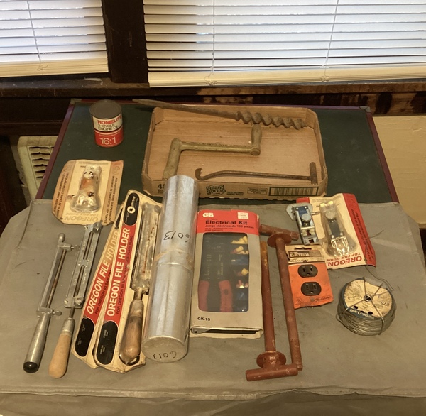 Old auger bit crank hook electrical kit welding rods, Oregon file holders Oregon top file guide metal wire electrical outlet. Some items are used. Some items are new.