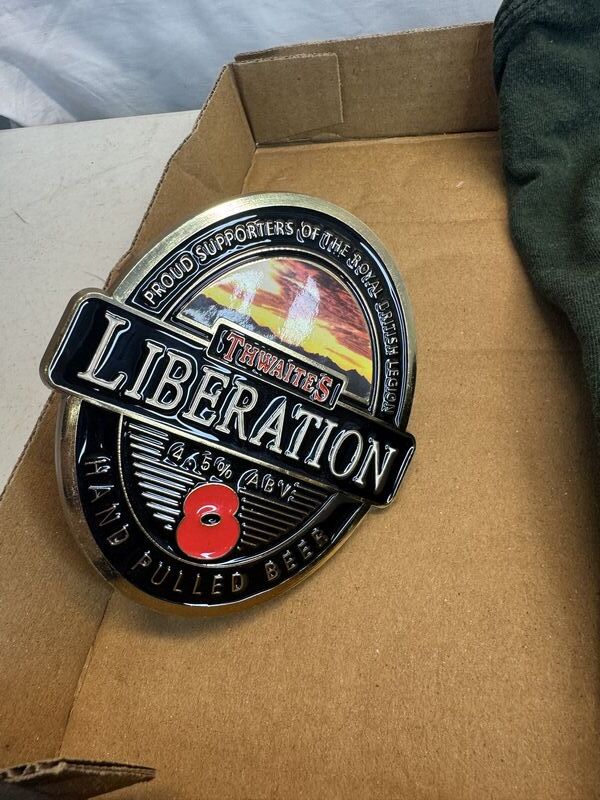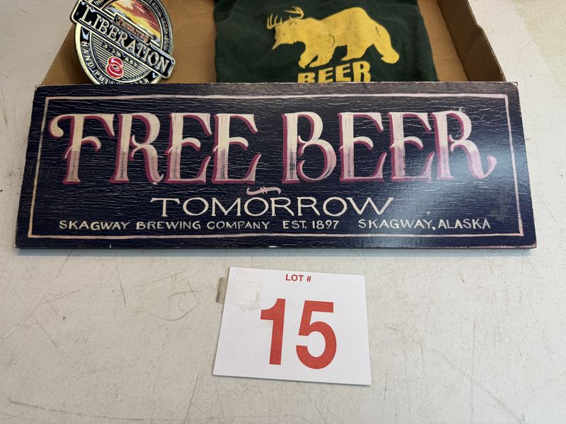 One Beer shirt size medium, men’s, a free beer wood sign and a tap handle plastic plaque see photos sold as is