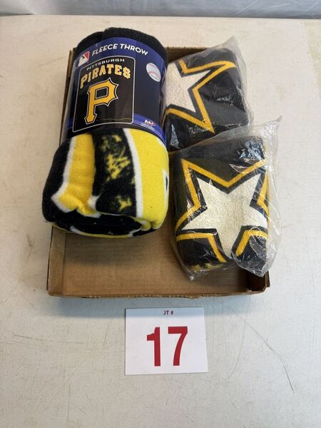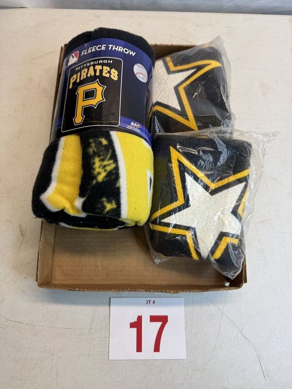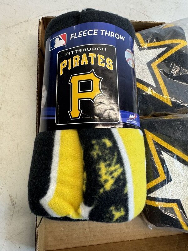 New unused fleece throw blanket, Pittsburgh Pirates and two sweat towels. See photos sold as is.
