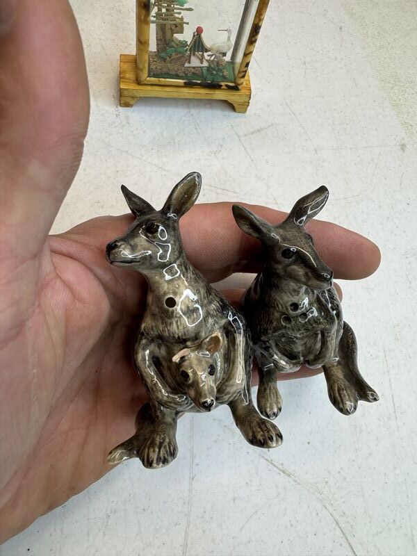 One of the kangaroos is missing an ear, the bird has a chip on its beak. See photos sold as is.