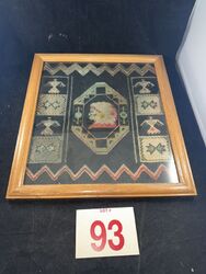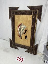 #103 - Embroidered Indian chief, head, portrait tapestry framed in tramp art