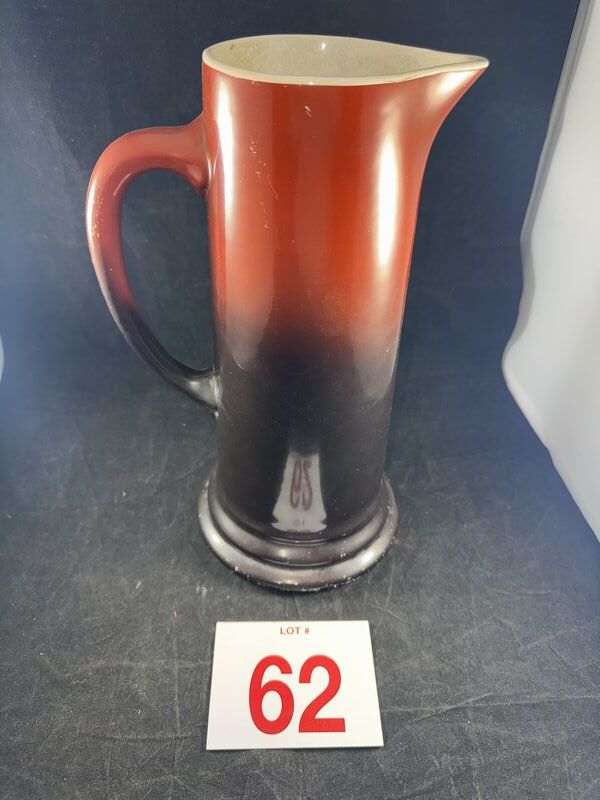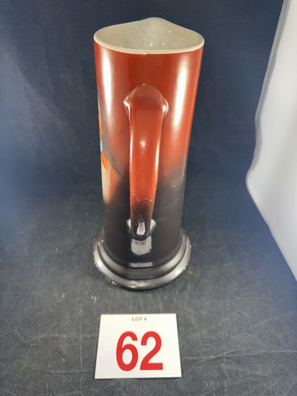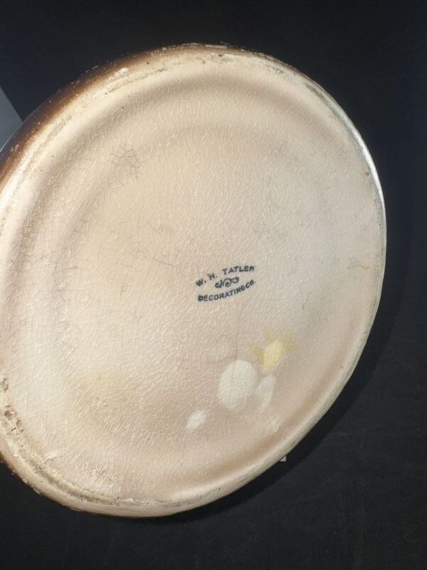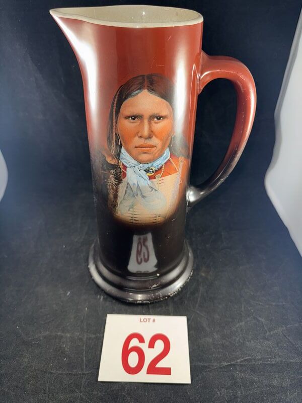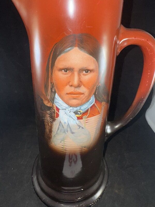 American Indian Brave W. H. Tatler Co. Early 1900's Ceramic Pitcher. 12.75 inches tall. 6.25 dia. base. light wear to gold top rim. Flea bite glaze wear on top of handle - see close up. No cracks, hairlines, chips see photos sold as is