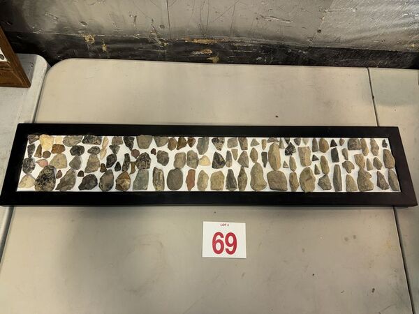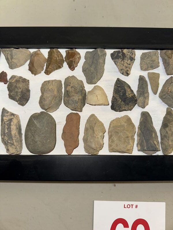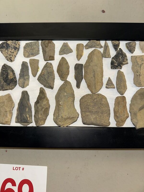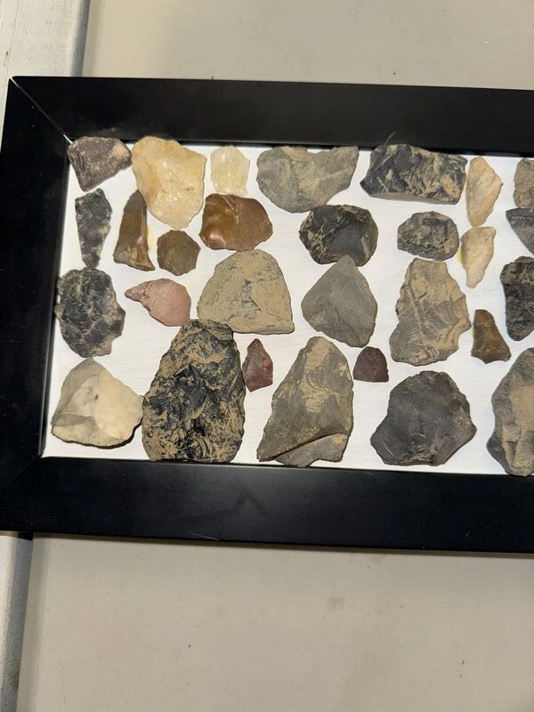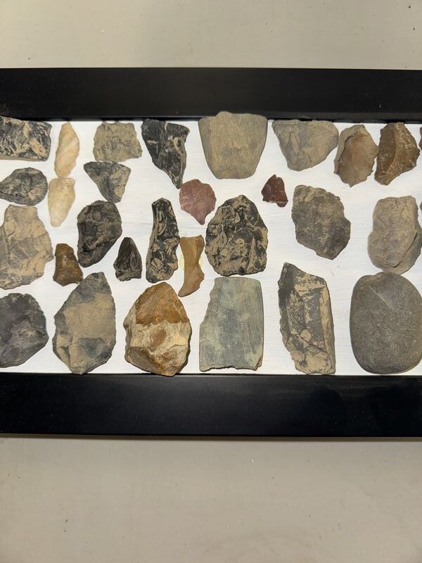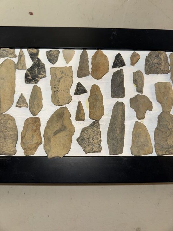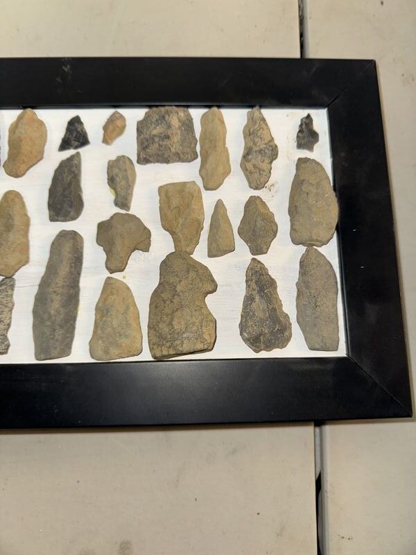 Various types of tools, arrowheads, artifacts glued to board, see photos sold as is