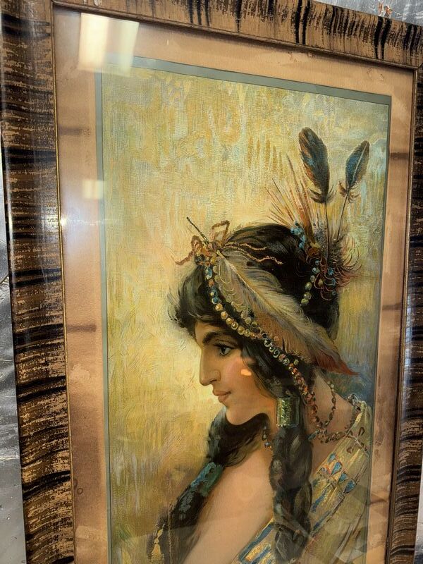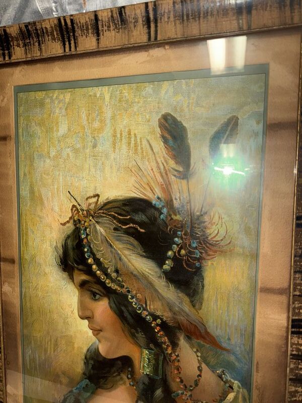 Framed behind glass. The poster shows an illustration of a pretty Native American woman. Made by Hayes Litho Co. Buffalo Ny. The poster displays very well and is rare in any condition. Item Dimensions: Framed: 40” x 20”