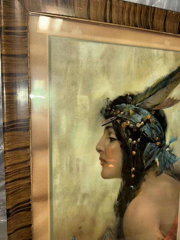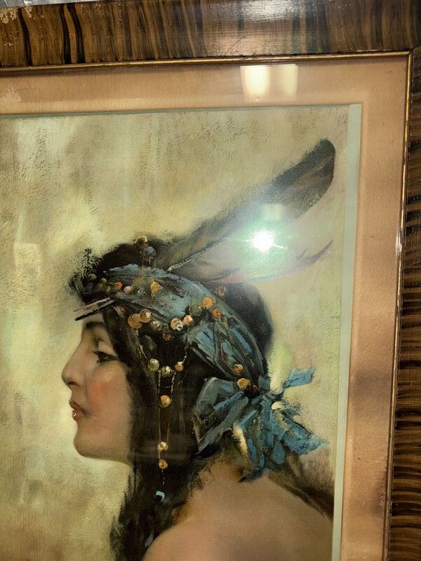 Framed behind glass. The poster shows an illustration of a pretty Native American woman. Made by Hayes Litho Co. Buffalo Ny. The poster displays very well and is rare in any condition. Item Dimensions: Framed: 40” x 20”40” x 20”